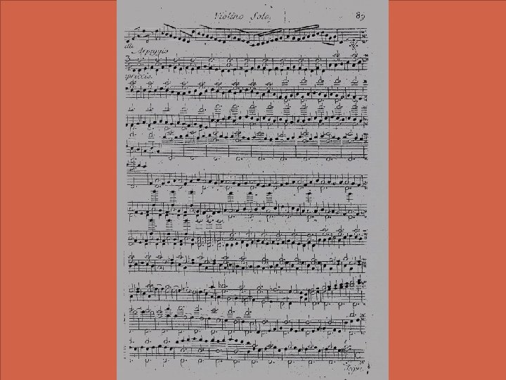 Pietro Antonio Locatelli (1695 -1763) �Da Bergamo si trasferì ad Amsterdam dove pubblicò le sue opere. �Si può definire l’anti-corelli nel senso che la sua tecnica violinistica si spinge verso le estreme propaggini del virtuosismo raggiungendo e anticipando il “virtuosismo trascendentale” paganiniano (posizioni acutissime [fino alla 17° posizione], smanicamenti, bicordi, staccati, spiccati) �Inserisce nei Concerti per violino e orchestra op. III dei capricci per ogni movimento riprendendo forse l’abitudine del bolognese Torelli che aveva iniziato ad aggiungere le cosiddette “perfidie” (peraltro di carattere improvvisativo) nei suoi concerti solistici
