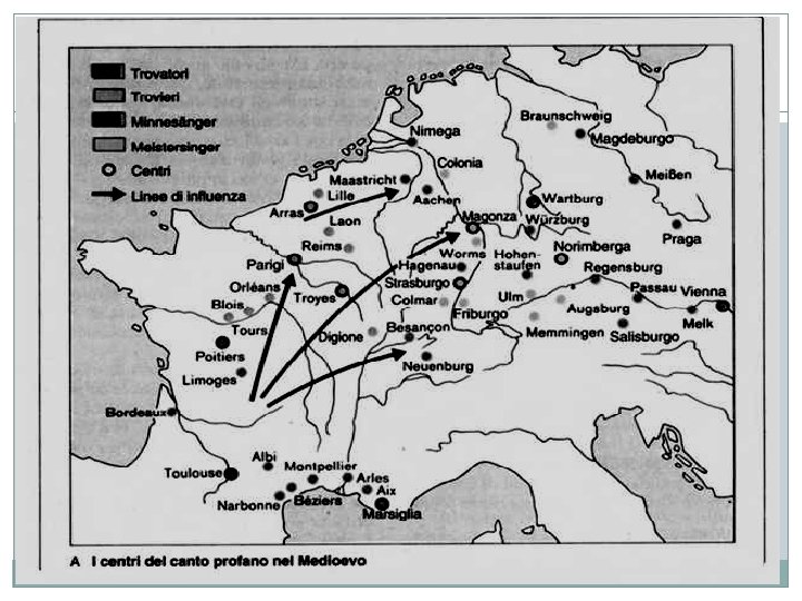 Le cause delle influenze �Cause della diffusione della lirica Trovadorica dal Sud al Nord della Francia: �matrimonio di Eleonora d’Aquitania con Luigi VII �Cause della diffusione della lirica Trovierica in Germania (Minnesänger): �matrimonio di Beatrice di Burgundia con Federico Barbarossa (XII secolo)