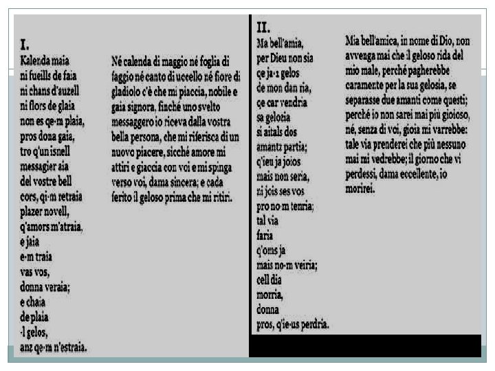 La Spagna �La collocazione geografica favorì un massiccio irradiamento della lirica provenzale anche in Spagna e Portogallo. �Non solo le corti di Catalogna, Castiglia e Aragona accolsero numerosi trovatori, ma gli stessi signori catalani si esercitarono nel poetare (la parlata del Limosino era usata in Catalogna prima che si imponesse il catalano). �L'influsso provenzale si prolungò in certe regioni fino al secolo XV.
