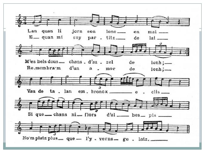 Gli chansonnieres �Sono i volumi contenenti le liriche dei Trovatori e dei Trovieri, testi e musiche. �Le musiche sono scritte su tetragramma e in notazione quadrata. �Probabilmente tale notazione indicava anche il ritmo dei canti, ma la mancanza di una trattatistica sull’argomento ha spinto gli studiosi a formulare diverse ipotesi sulla loro trascrizione in notazione moderna.