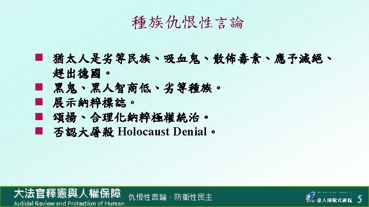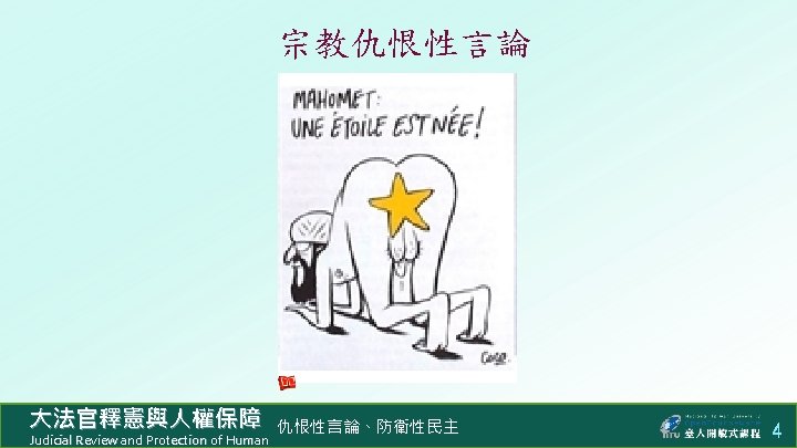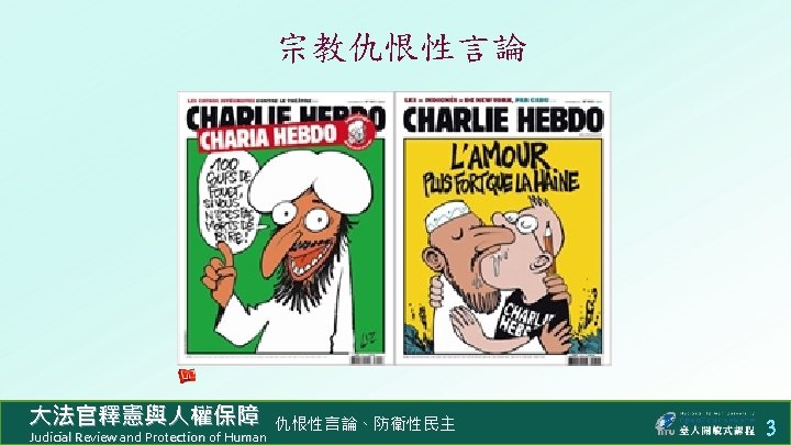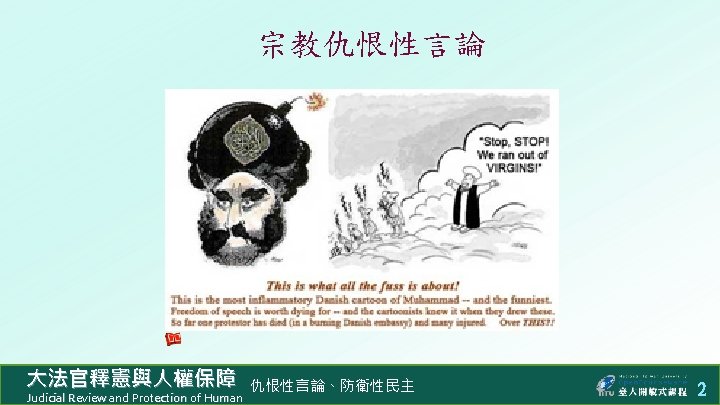 n 644 http www judicial gov twconstitutionalcourtp 0301 Slides: 8 Download presentation 防衛性民主 n 釋字第 644 號解釋:禁止違憲人民團體 http: //www. judicial. gov. tw/constitutionalcourt/p 03_01. asp? expno=644 n 憲法增修條文 § 5 v:禁止違憲政黨 http: //www. judicial. gov. tw/constitutionalcourt/p 07_2. asp? lawno=47 n 臺灣政黨總數 https: //zh. wikipedia. org/wiki/%E 4%B 8%AD%E 8%8 F%AF%E 6%B 0%9 1%E 5%9 C%8 B%E 6%94%BF%E 9%BB%A 8%E 5%88%97%E 8%A 1%A 8 大法官釋憲與人權保障 Judicial Review and Protection of Human 仇恨性言論、防衛性民主 6 版權聲明 頁碼 作品 版權圖示 來源 / 作者 簡報佈景主題 / 臺大開放式課程 本作品以創用 CC「姓名標示- 非商業性- 相同方式分享」臺灣 3. 0 版授權釋出。 1 -8 2 Stop! We ran out of virgins! (https: //beliefdelusion. wordpress. com/2014/10/22/stop-we-ran-out-of-virgins/), 瀏覽日期: 2016/04/08,本作品依著作權法第 46、52、65 條合理使用。 3 Charlie Hebdo: Martyrs for the Truth / Abigail R. Esman (http: //www. investigativeproject. org/4719/charlie-hebdo-martyrs-for-the-truth#), 瀏覽日期: 2016/04/08,本作品依著作權法第 46、52、65 條合理使用。 A star is born! (http: //thosewhocansee. blogspot. tw/2015/07/reacting-to-spree-killings-progressively. html), 瀏覽日期: 2016/04/08。本作品依著作權法第 46、52、65 條合理使用。 4 7 臺灣只是中國叛離的 一省⋯⋯徹底根除癌細 胞。 大法官釋憲與人權保障 Judicial Review and Protection of Human 維基百科 / 郭冠英 (https: //zh. wikipedia. org/wiki/郭冠英), 瀏覽日期: 2016/04/08,本作品以創用 CC「姓名標示 - 相同方式分享」3. 0 版授權釋出。 仇恨性言論、防衛性民主 8