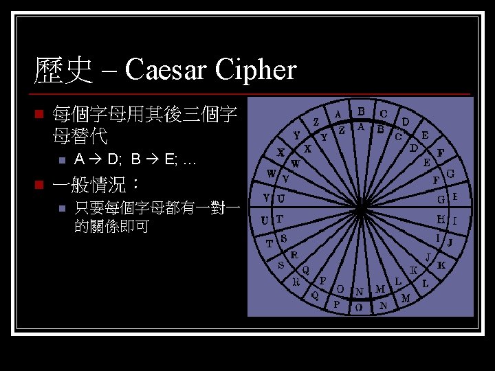 歷史 – Vigenère Cipher n Vigenère cipher n 明文:ABCDEFGHIJKLMNOPQRSTUVWXYZ 組一:ZYXWVUTSRQPONMLKJIHGFEDCBA 組二:LMNOPQRSTUVWXYZABCDEFGHIJK n n n 明文:I CAME I SAW I CONQUERED 密文:R NZXV T HLD T XZMBFPIPW 密文: RNZXVTHLDTXZMBFPIPW