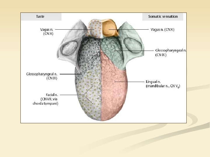 Miért jó, hogy van n. glossopharyngeusunk? n n nyelés: m. stylopharyngeus, m. constrictores pharyngis általános érzékelés: oropharynx (torokfájás!) ízérzés: a nyelvgyökön nyálelválasztás: gl. parotis vérnyomás, p. H, O 2, CO 2: carotis sinus és glomus A glossopharyngeus izolált károsodásakor legfeljebb a nyelészavart vennénk észre!!!