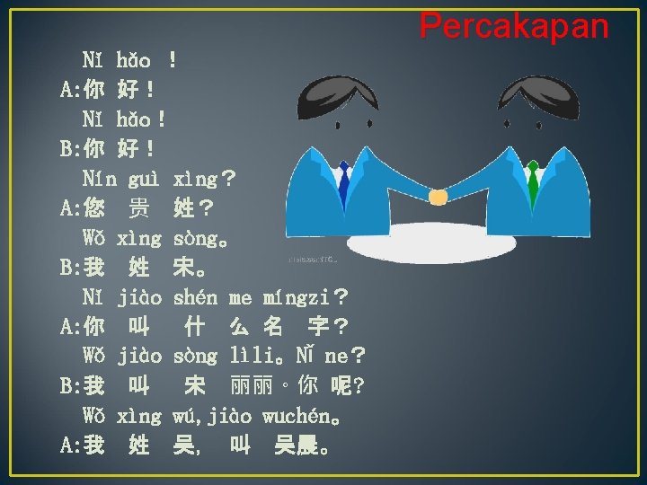 nǐ hǎo! Kalimat 1 你 好!Apa kabar! nín guì xìng? 2 您 贵 姓?Apa marga anda? Wǒ xìng 我 姓…… marga saya…… nǐ jiào shén me míngzi? 3 你 叫 什 么 名 字?Siapa nama kamu? wǒ jiào 我 叫……nama saya……