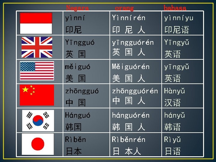 kata-kata baru Hěn 很 sangat bù 不 tidak Guó 国 negara yě 也 juga nǎ 哪 mana rén 人 orang shì 是 adalah yǔ 语 bahasa