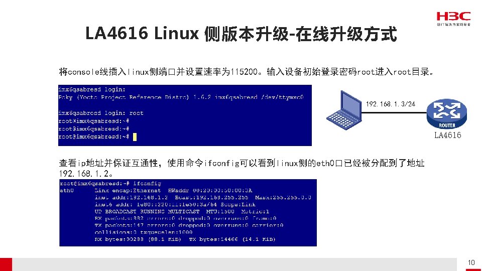 LA 4616 Linux 侧 基 本 维 护-Linux侧 • 网口信息查询命令ifconfig eth 0(是输入ifconfig还是ifconfig eth 0?),可以查看 IP地址、MAC地址等网口信息。 • 设置静态IP,ifconfig eth 0 xxx netmask nnn • xxx:IP地址(如172. 32. 107. 124) • nnn:子网掩码(如255. 0. 0) Confidential 秘密 www. h 3 c. com 31 31 31