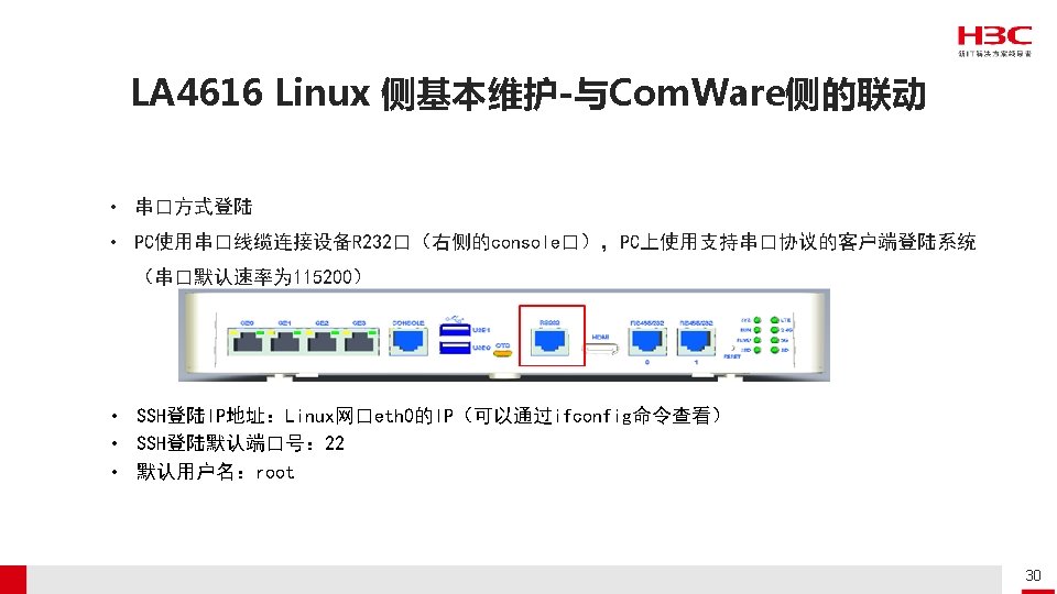 LA 4616 Linux 侧基本维护-与Com. Ware侧的联动 • 在Com. Ware侧reboot slot 1即可重启Linux系统。 • 在Com. Ware侧查看Linux相关版本时可以display version下拉,查看slot 1的driver行 即可。 Confidential 秘密 www. h 3 c. com 29 29 29