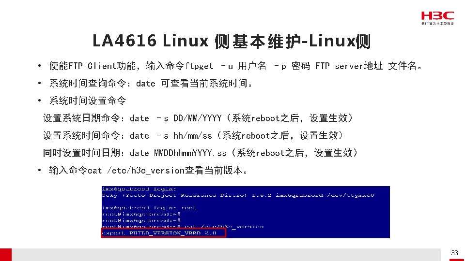 01 01 LA 4616 Com. Ware 侧版本说明 02 LA 4616 Linux 侧版本说明 03 LA 4616 License 说明 04 LA 4616 Linux 侧基本维护 Confidential 秘密 www. h 3 c. com 3 33