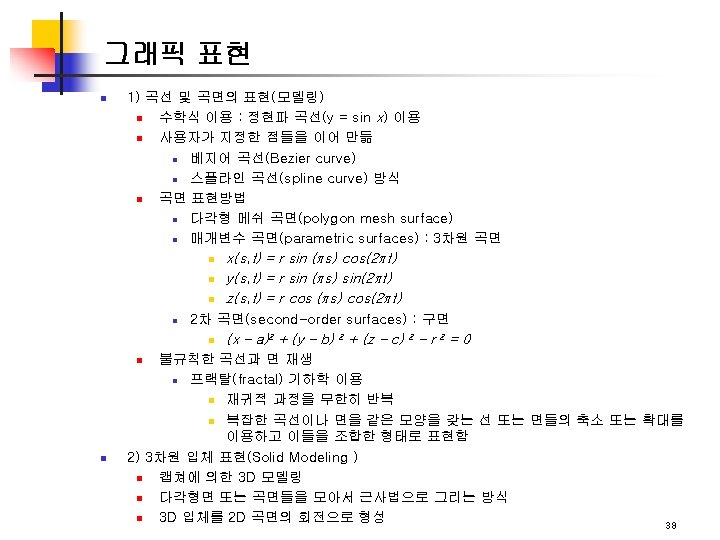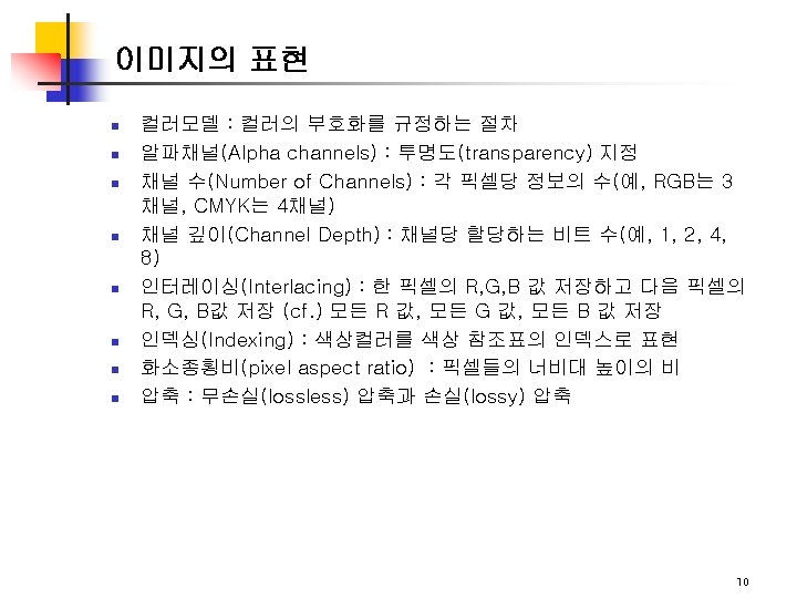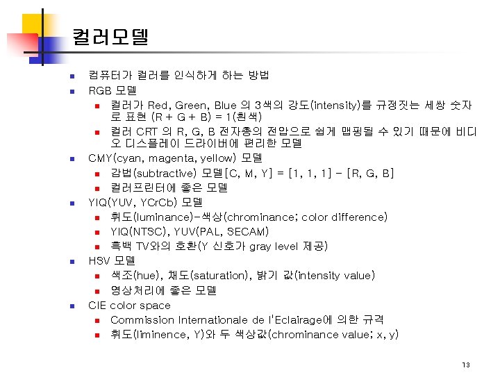CIE(Commission Internationale de l'Eclairage) 모델 n CIE chromaticity diagram (illuminant C: x=0. 31, y=0. 316, Y=100. 0) n Amount of CIE primaries needed to display spectral colors 17