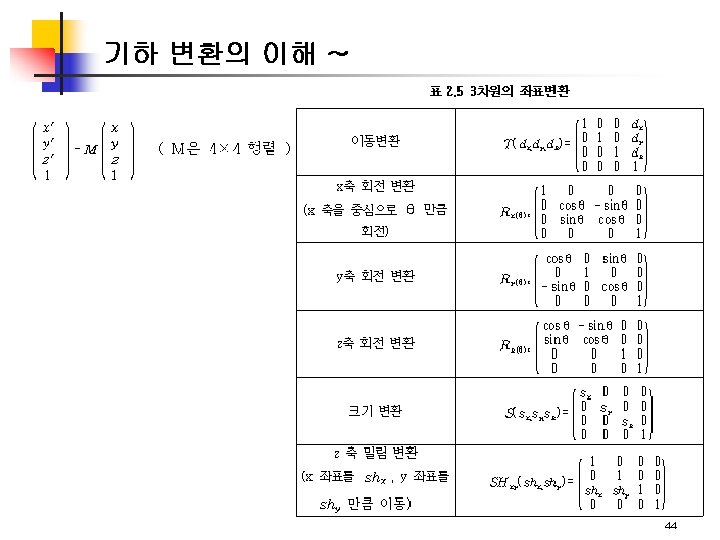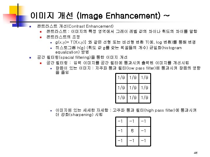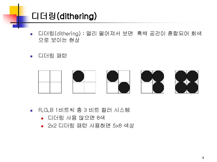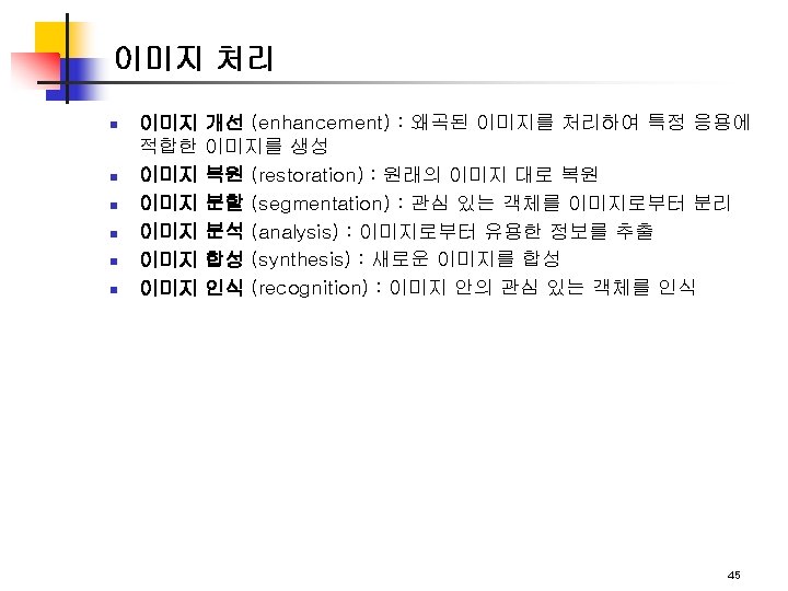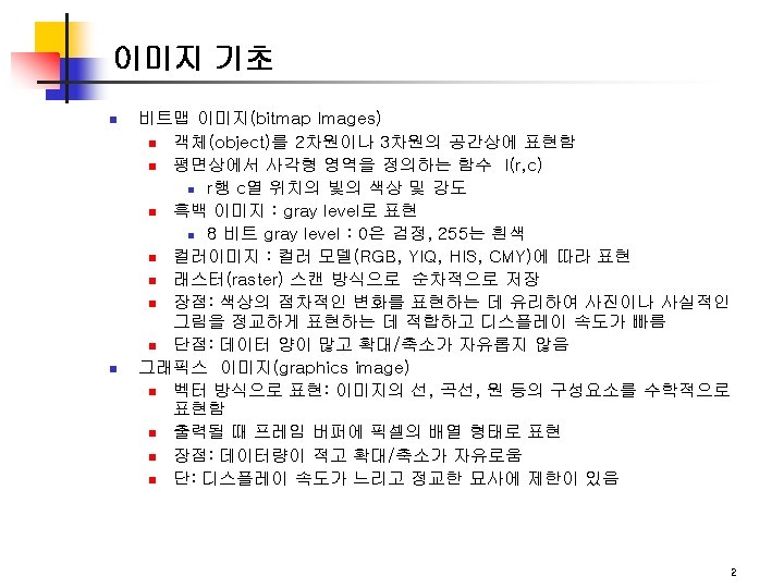 CMY 모델 n n n 감법(subtractive) 공간 n Cyan(청록색) : Red의 보색(complementary color) n Magenta(심홍색) Green의 보색 n Yellow(노랑색) : Blue의 보색 컬러 프린터에서 흰색 바탕에 색을 뿌릴 때 CMY와 RGB 변환 공식: [C, M, Y] = [1, 1, 1] – [R, G, B] CMY로 만들어 내는 8색 최소 팔레트(minimum palette of 8 colors) n Red : Yellow + Magenta n Green : Cyan + Yellow n Blue : Magenta + Cyan n Yellow : Yellow n Cyan : Cyan n Magenta : Magenta n White : n Black : Yellow + Cyan + Magenta CMYK: C+M+Y가 best black을 만들지 못하므로 K(pure black) 추가 15