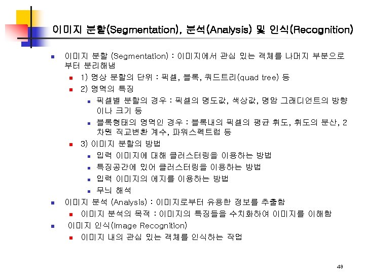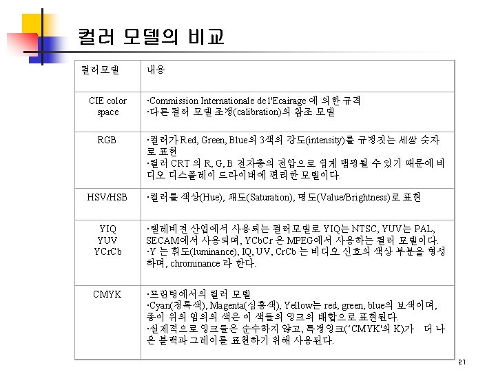 YIQ 모델(YUV, YCr. Cb) n n RGB와 YIQ (NTSC)와의 변환 관계 n Y(luminance: CIE의 Y) = 0. 30 R + 0. 59 G + 0. 11 B n I(chrominance: orange-cyan hue) = 0. 60 R - 0. 28 G - 0. 32 B n Q(chrominance: green-magenta hue) = 0. 21 R - 0. 52 G + 0. 31 B n R = 1. 0 Y + 0. 956 I + 0. 620 Q n G = 1. 0 Y – 0. 272 I – 0. 647 Q n B = 1. 0 Y – 1. 108 I – 1. 705 Q RGB와 YUV (PAL, SECAM)의 변환 관계 n Y = 0. 30 R + 0. 59 G + 0. 11 B n U = (B-Y) × 0. 493 n V = (R-Y) × 0. 877 n R = 1. 0 Y + 0. 956 U + 0. 621 V n G = 1. 0 Y – 0. 272 U – 0. 647 V n B = 1. 0 Y – 1. 1061 U – 1. 703 V RGB와 YCr. Cb (MPEG)와 변환 관계 n Y = 0. 30 R + 0. 59 G + 0. 11 B n Cr = R-Y n Cb = B-Y RGB의 CIE coordinates (illuminant C: x=0. 31, y=0. 316, Y=100. 0) Red Green Blue x 0. 67 0. 21 0. 14 y 0. 33 0. 71 0. 08 19