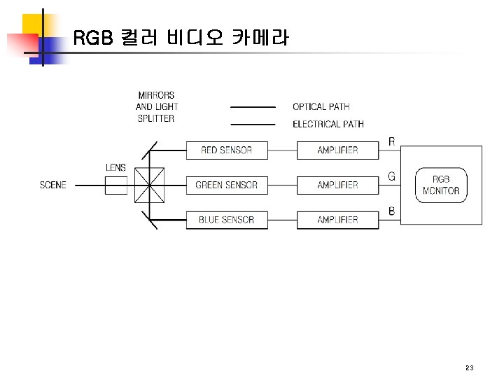 정신 물리학 (Psychophysics) n Spectral-response functions of each of the three types of cones on the human retina n Luminous-efficiency function for the human eye R +G + B 18