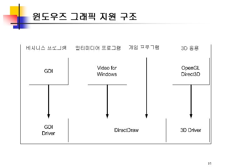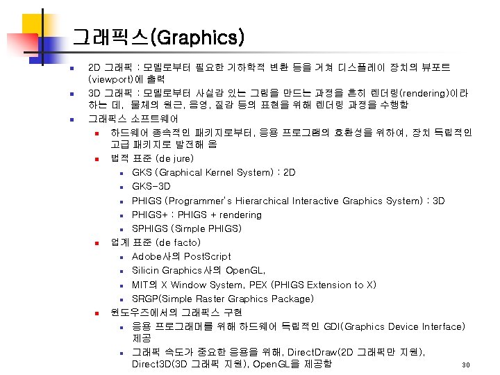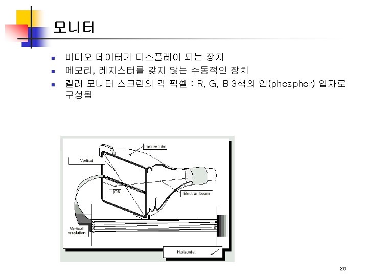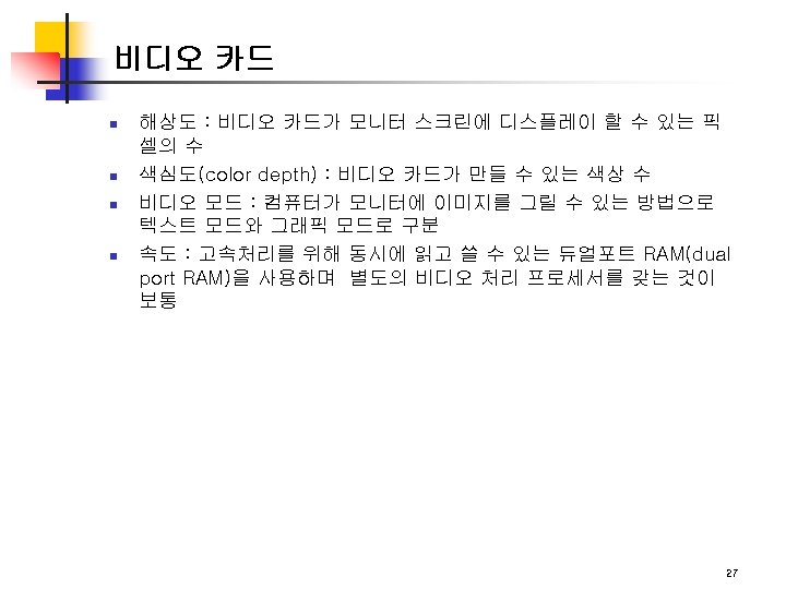 비디오 카드 모드 내용 Monochrome Display Adapter(MDA), 1981 IBM-PC 표준, 모노크롬, 텍스트 전용, 25 라인 × 80 컬럼 Color Graphics Adapter(CGA), 1981 컬러 그래픽, 320× 200(4 컬러) 640× 200 (2 컬러) Hercules Graphics Card(HGC), 1982 모노크롬 그래픽, 720× 348 Enhanced Graphics Adapter(EGA), 1985 컬러그래픽, 64 컬러 팔레트, 640× 480(16 컬러), 자체 Video BIOS 지원 Video Graphics Array(VGA), 1987 컬러그래픽, 640× 480(16 컬러) 320× 200(256 컬러), 아날로그 컬러 신호, own Video BIOS 지원 Super VGA(SVGA), 1989 컬러 그래픽, 800× 600(16 컬러)* 자체 Video BIOS 지원 (*현재, 1024× 768(24비트 컬러) 까지 지원) 28