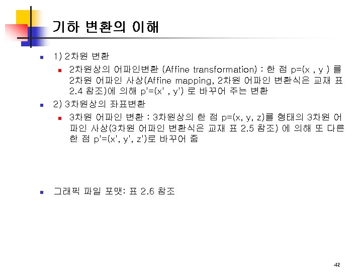 프랙탈: Random IFS(Iterated Function System) 예3 for n=1 to numits /* 같은 확률로 1, 2, 3 중 하나 선택 */ k = int (3 * rnd – 0. 00001) +1 /* affine transformation */ w a b c d e f P newx = a[k]*x + b[k]*y + e[k] newy = c[k]*x + d[k]*y + f[k] x = newx y = newy if n > 10 then pset (x, y) iterations next end 1 0 0. 16 0 0 0. 01 2 0. 85 0. 04 -0. 04 0. 85 0 1. 6 0. 85 3 0. 2 -0. 26 0. 23 0. 22 0 1. 6 0. 07 4 -0. 15 0. 28 0. 26 0. 24 0 0. 44 0. 07 41