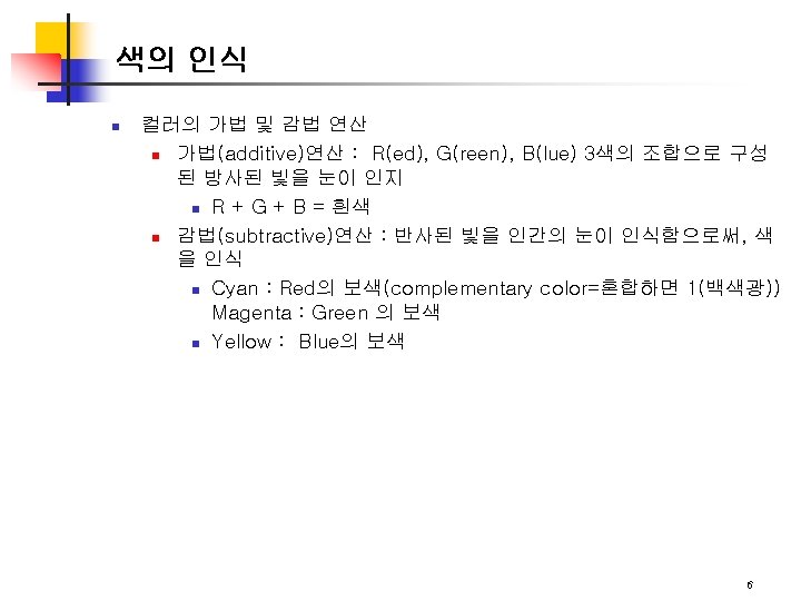 색의 인식 ~ n n n 감지된 빛의 특성 n 색조(hue, color): 우세한 주파수(dominant frequency) n 채도(purity, saturation): 포화도(백색과의 혼합정도), pastel 색은 덜 포화됨 n 명도, 휘도(brightness, luminance): 빛의 강도(intensity of light) 복사 에너지(radiant energy) 색채(chromaticity) = 색조(hue) + 채도(saturation) 명칭 n Rood: hue luminosity purity n Hurst: hue brightness purity n Wundt: tone lightness purity n Rigway: wave-length luminosity chroma n Munsell: hue value chroma 5