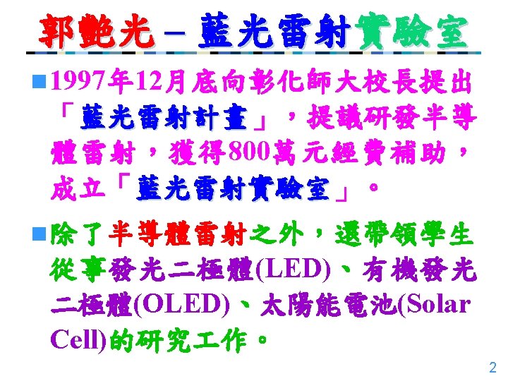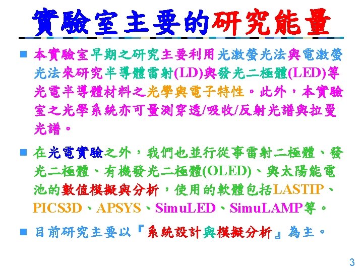 近年來主要的研究主題 n Light-Emitting Diodes (LED) n Laser Diodes & VCSEL n Light-Emitting Diodes (OLED) n Solar Cells (Si & III-V) n Others (III-N Band Structures & Bowing Parameters, Solid-State Lasers, etc. ) (數篇SCI論文被引用 數在 10次以上) 17