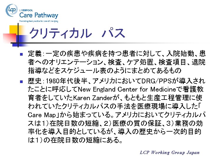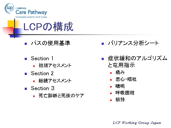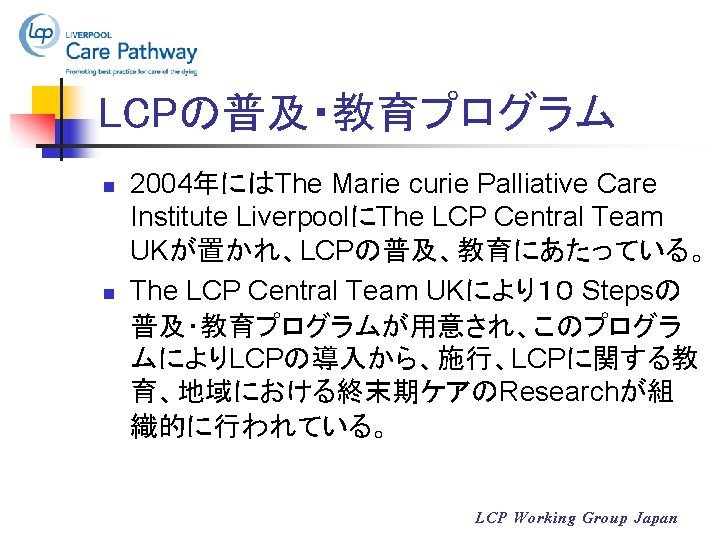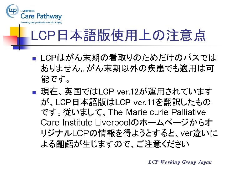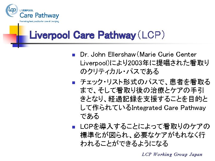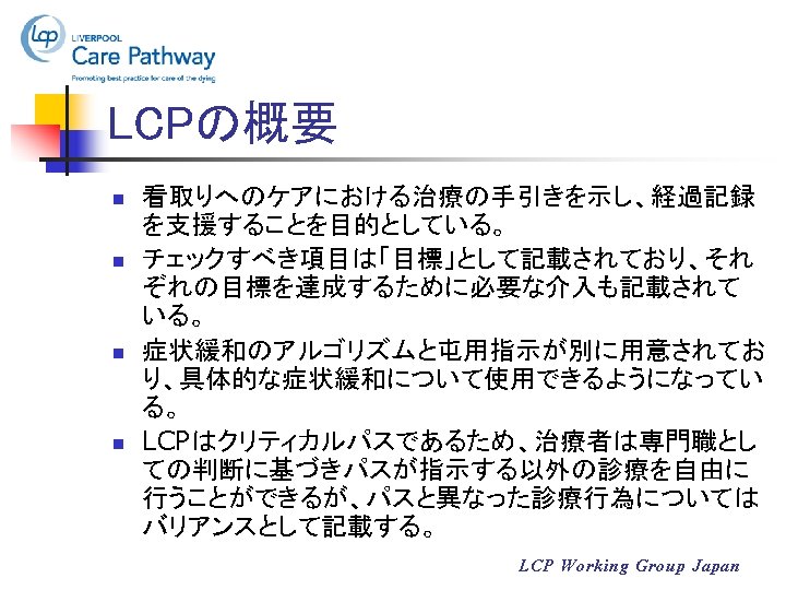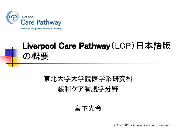 看取りのパス n Liverpool Care Pathway 作成者:Royal Liverpool University および Marie Curie Center Liverpool 参照website http: //www. mcpcil. org. uk/liverpool-carepathway/index. htm n Palliative Care for Advanced Disease 作成者:Beth Israel Medical Center Department of Pain Medicine and Palliative Care 参照website http: //www. stoppain. org/services_staff/pc ad 1. html LCP Working Group Japan
