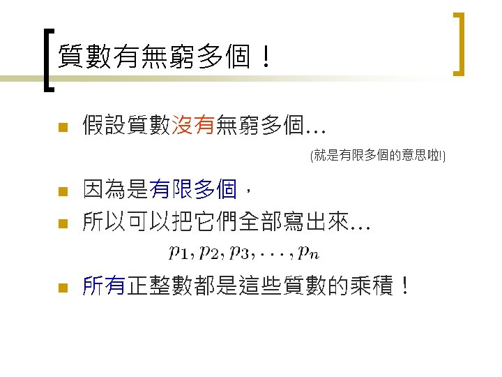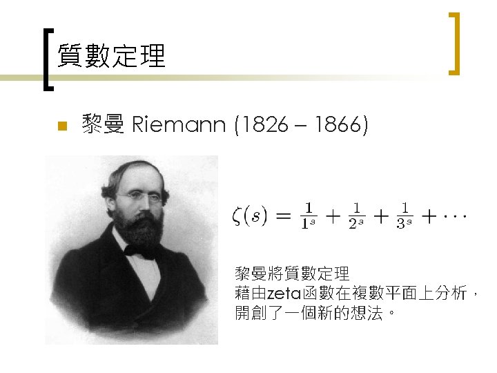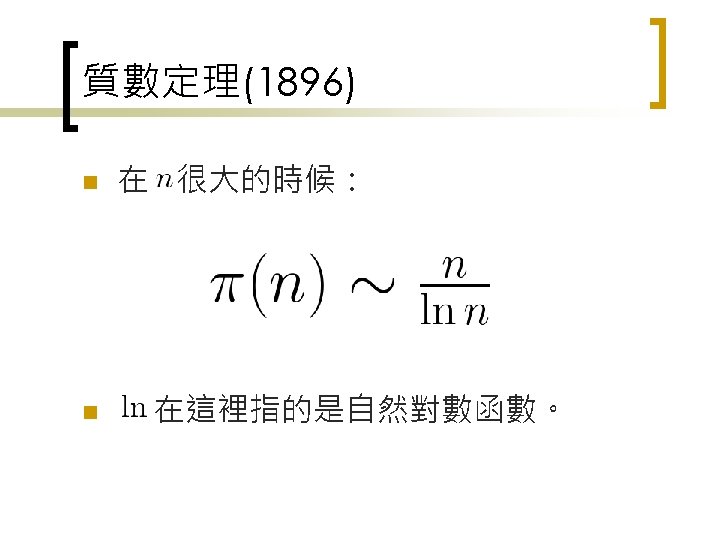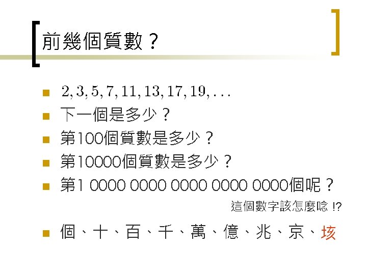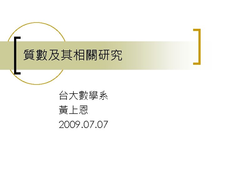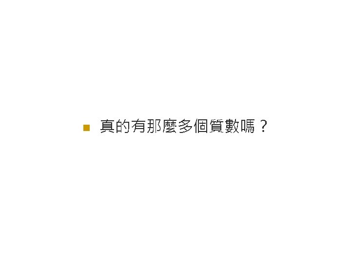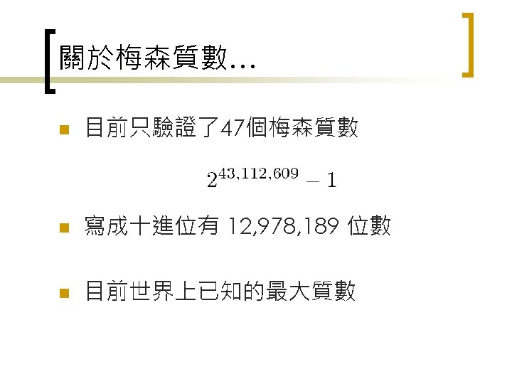 大質數發現史 n n n G reat Internet M ersenne P rime Search GIMPS 1996年開始 目前世界上已知最大的13個梅森質數