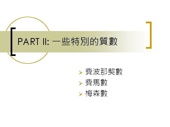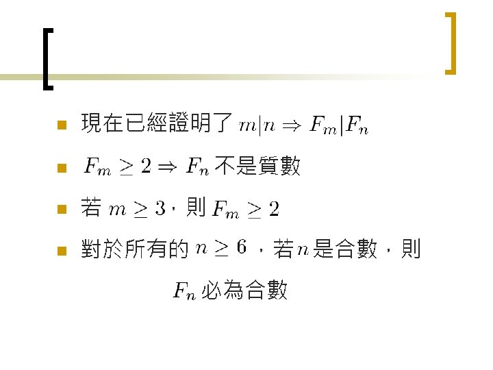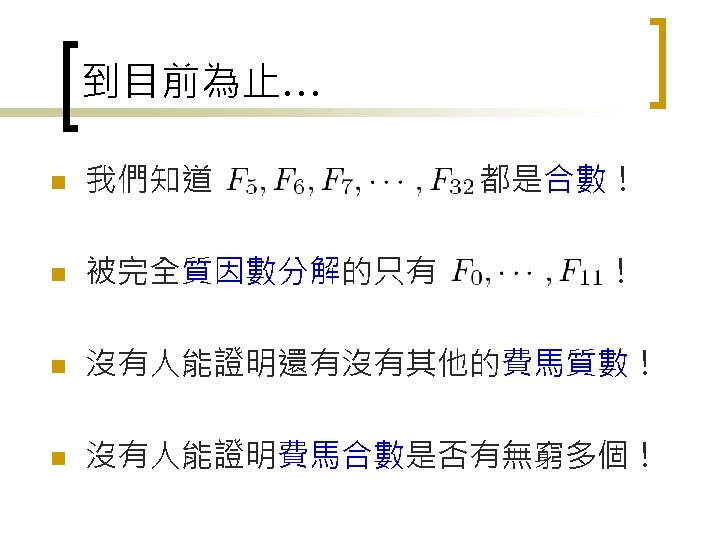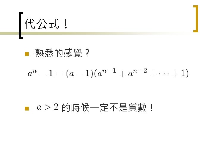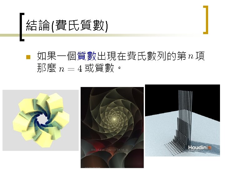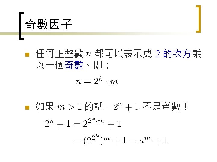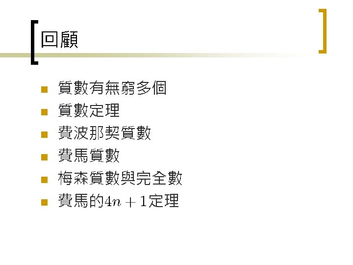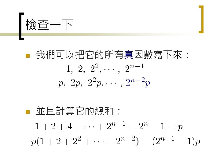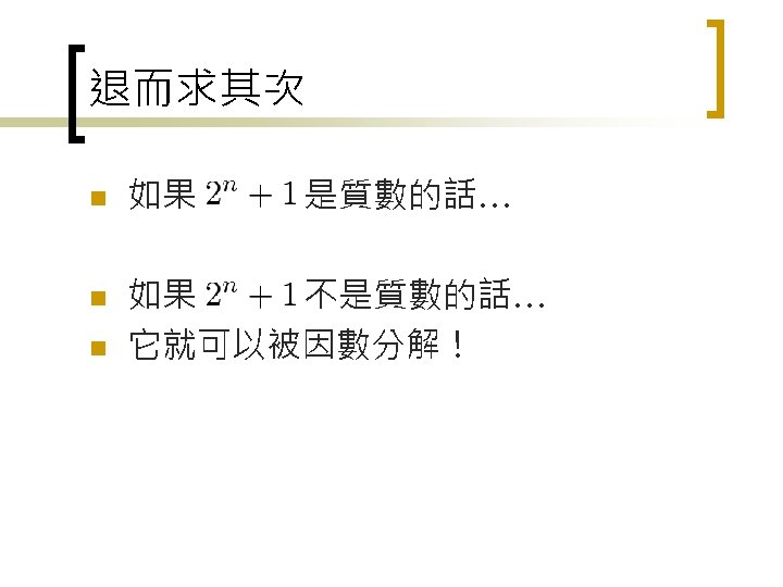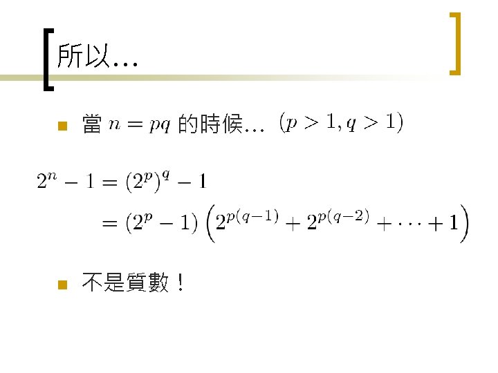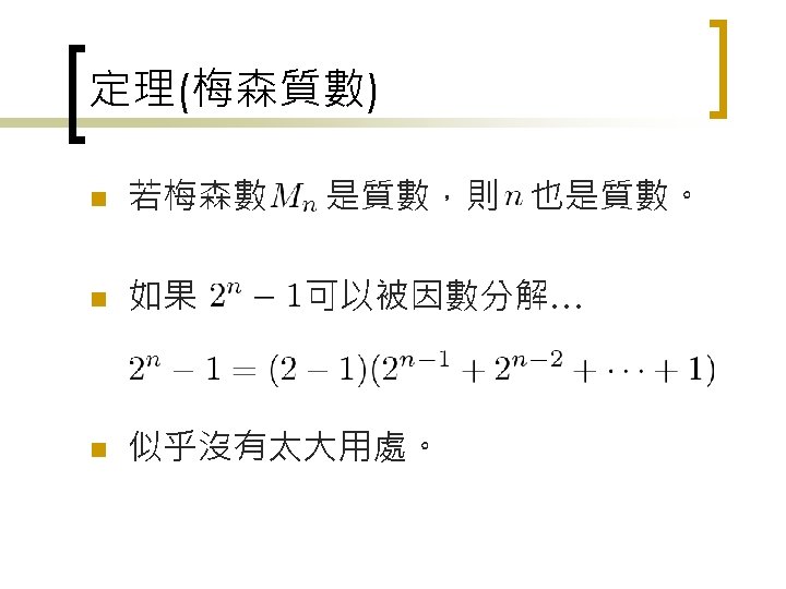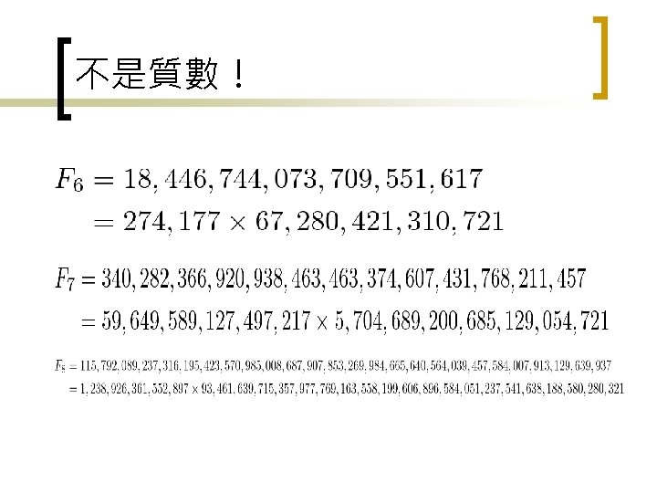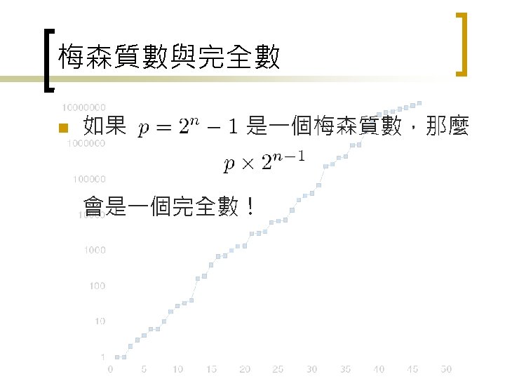Lucas-Lehmer 質數檢驗法 n n 定義一個遞迴數列: 前幾項是 4, 194, 37634, 1416317954, 2005956546822746114, 4023861667741036022825635656102100994, 16191462721115671781777559070120513664958590125499 … 158514329308740975788034 當 是奇質數的時候, 是質數若且唯若