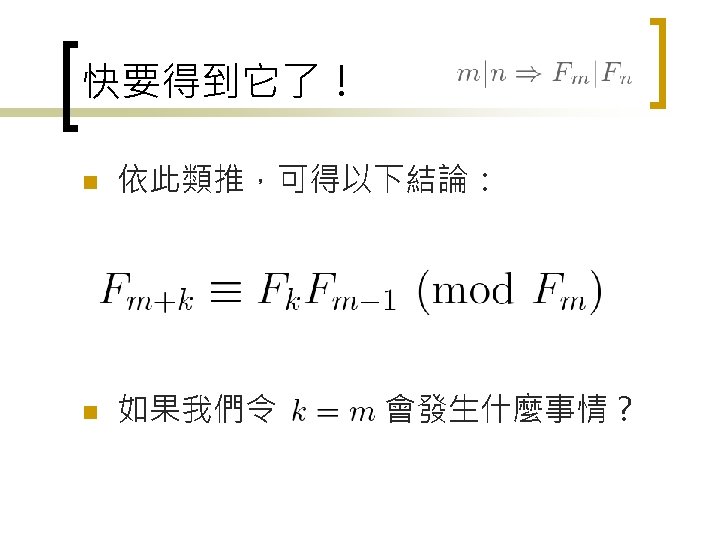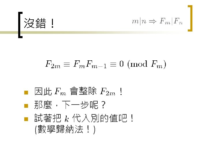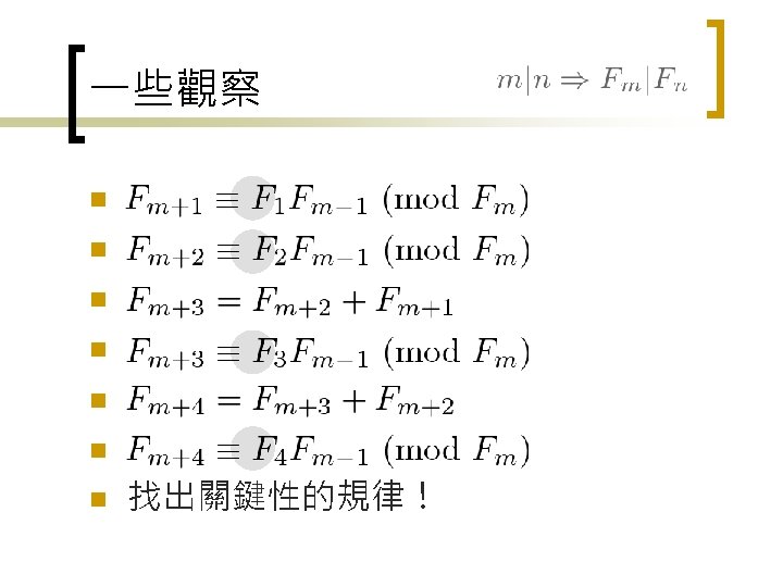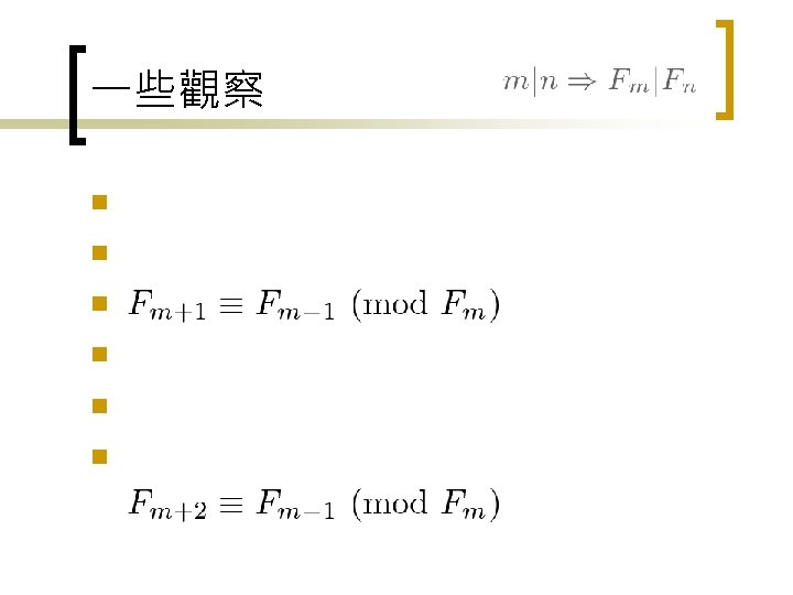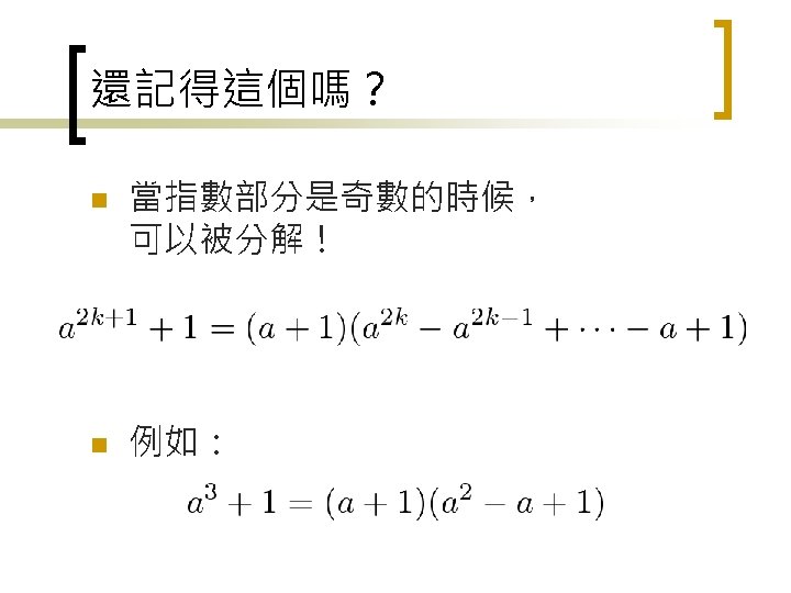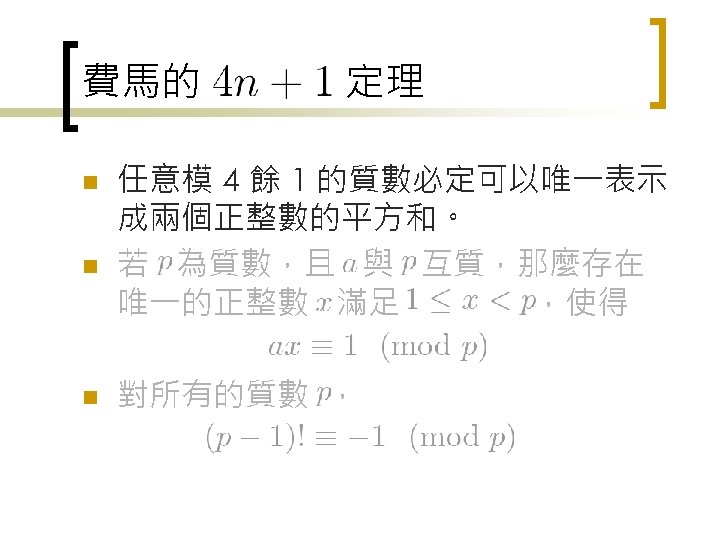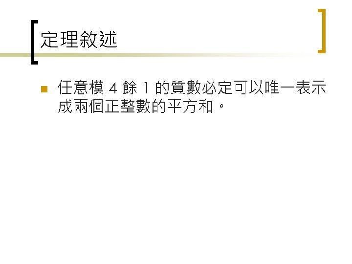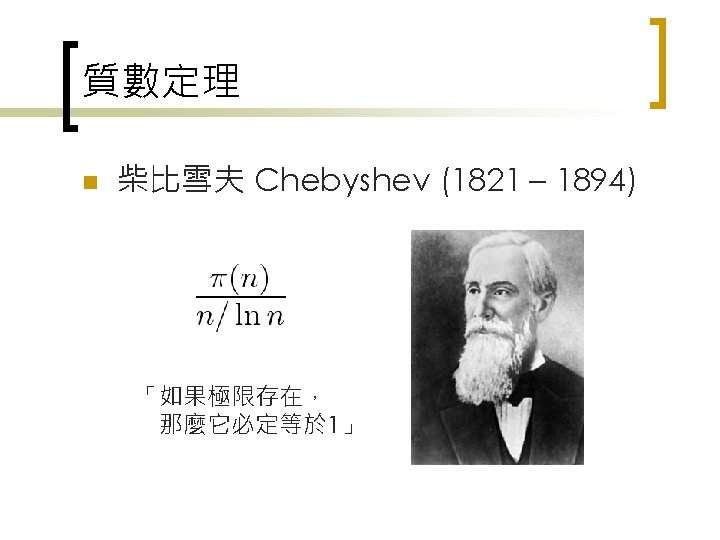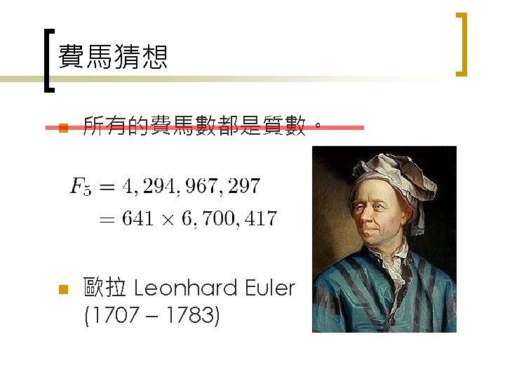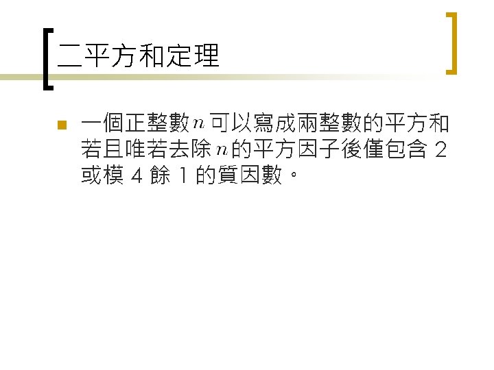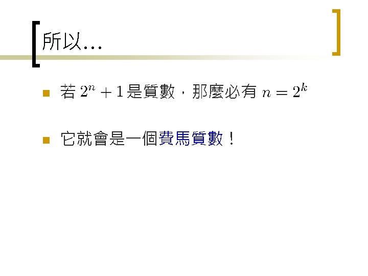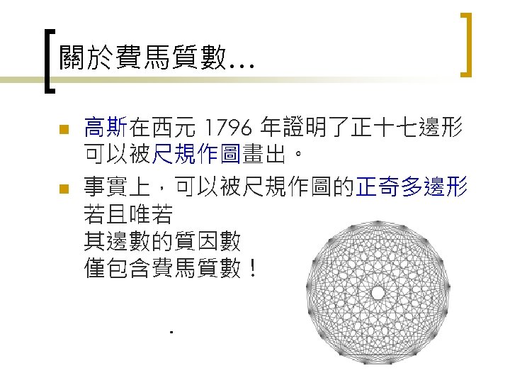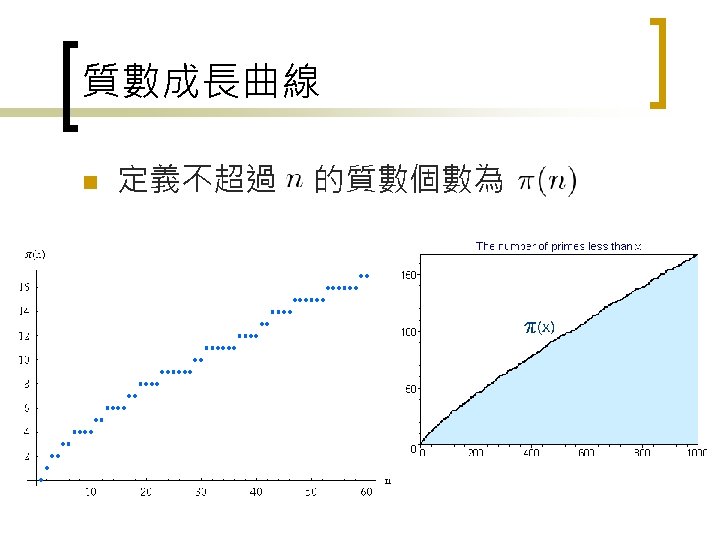Lucas-Lehmer 質數檢驗法 n n 定義一個遞迴數列: 前幾項是 4, 194, 37634, 1416317954, 2005956546822746114, 4023861667741036022825635656102100994, 16191462721115671781777559070120513664958590125499 … 158514329308740975788034 當 是奇質數的時候, 是質數若且唯若