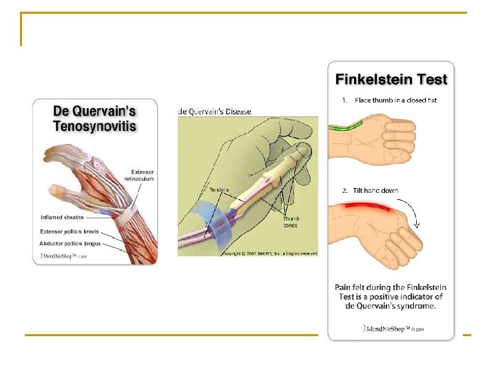 De Quervain Tenosynovitis n n n n De Quervain tenosynovitis is an entrapment tendinitis of the tendons contained within the first dorsal compartment at the wrist; it causes pain during thumb motion. Etiology The tendons of the abductor pollicis longus and the extensor pollicis brevis are tightly secured against the radial styloid by the overlying extensor retinaculum. Any thickening of the tendons from acute or repetitive trauma restrains gliding of the tendons through the sheath. Efforts at thumb motion, especially when combined with radial or ulnar deviation of the wrist, cause pain and perpetuate the inflammation and swelling. Clinical Patients note pain resulting from thumb and wrist motion, along with tenderness and thickening at the radial styloid. Crepitation or actual triggering is rarely noted. Patients frequently are mothers of infants aged 6 -12 months, and symptoms are often noted in both wrists. Repetitive lifting of the baby as it grows heavier is responsible for friction tendinitis. Day care workers and other persons who repetitively lift infants are frequently affected as well. De Quervain tenosynovitis can also develop in individuals who have sustained a direct blow to the area of the first dorsal compartment. Examination The first dorsal compartment over the radial styloid becomes thickened and feels bone hard; the area becomes tender. Usually, the compartment's thickening so distorts the sparsely padded skin in this area that a visible fusiform mass is created. The Finkelstein test (consisting of flexion of the thumb across the palm and then ulnar deviation of the wrist) causes sharp pain at the first dorsal compartment. Tenderness is absent over the muscle bellies proximal to the first dorsal compartment. Tenderness and pain on axial loading are absent at the carpometacarpal (CMC) joint unless the patient has arthritis in that joint.