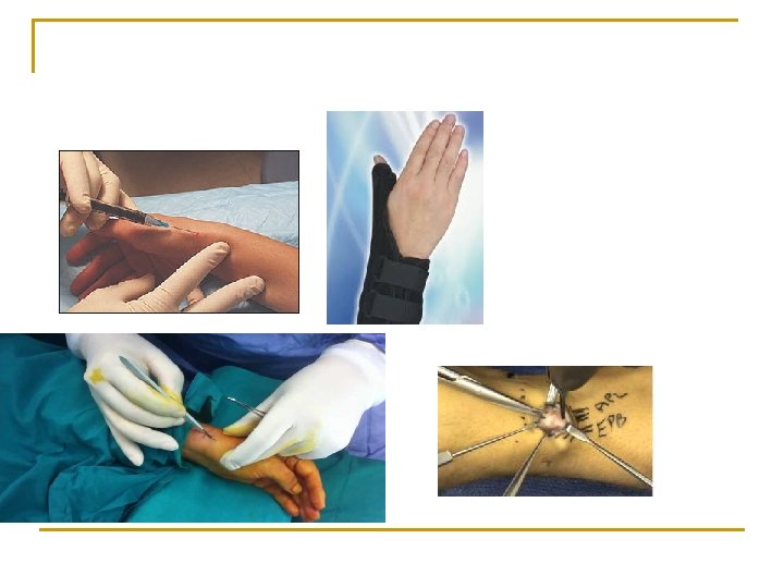 n n Medical therapy Splinting of the thumb and wrist relieves symptoms, but most patients find the loss of the thumb for functional activities too restrictive and do not consistently wear the splints. Injection of corticosteroid into the sheath of the first dorsal compartment reduces tendon thickening and inflammation. A dose of 0. 5 m. L of 1% plain Xylocaine and 0. 5 m. L of a long-acting corticosteroid preparation can be injected either sequentially or simultaneously. One injection permanently relieves symptoms in roughly 50% of patients. A second injection given at least a month later permanently relieves symptoms in another 40 -45% of patients. Surgical therapy If injection therapy fails, surgical release of the first dorsal compartment relieves the entrapment.