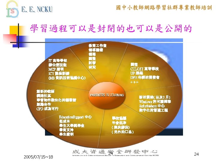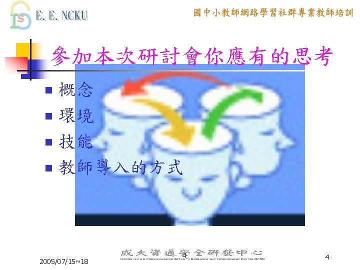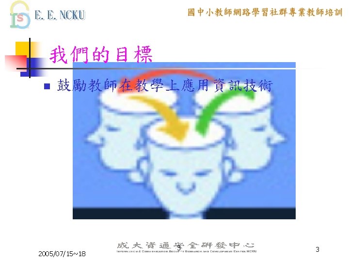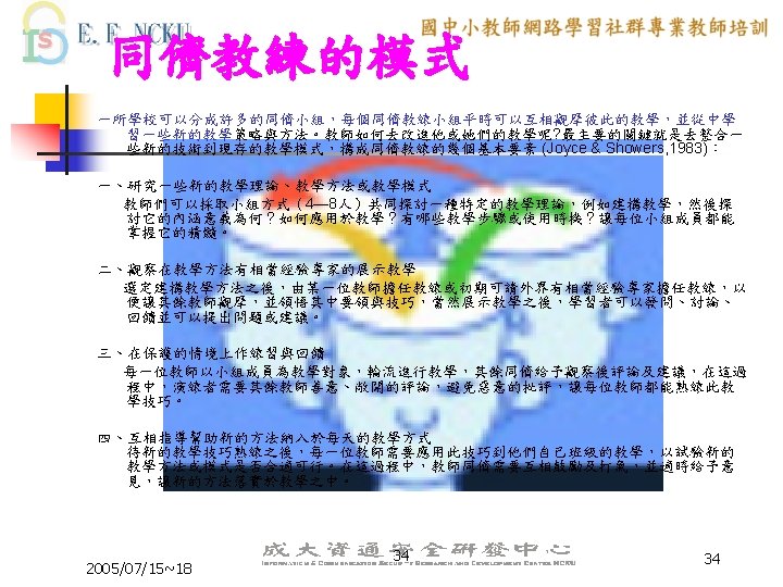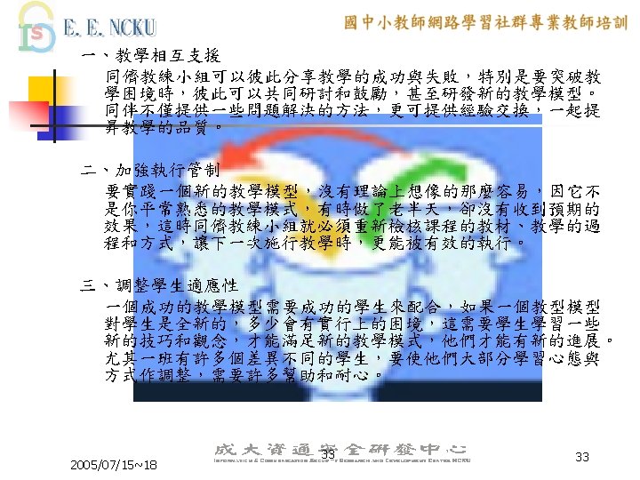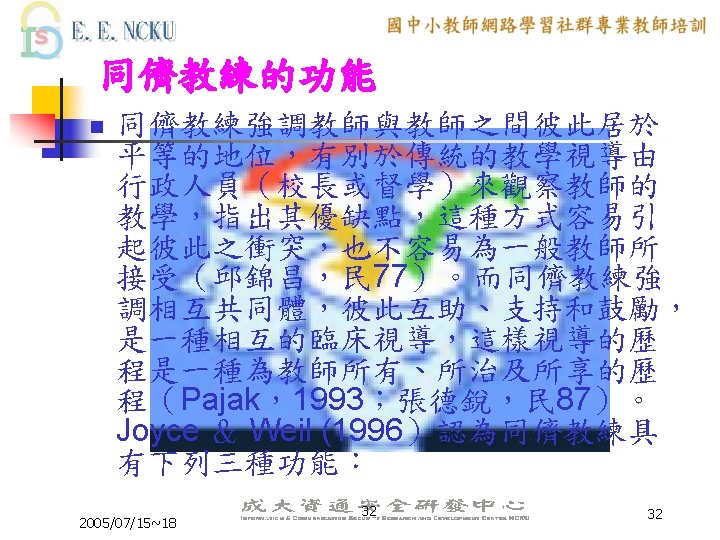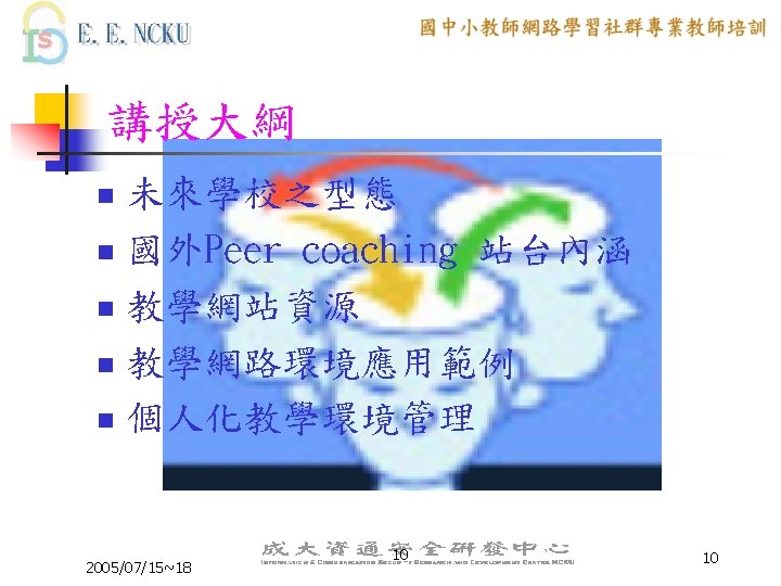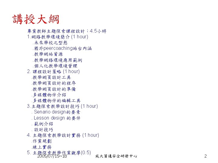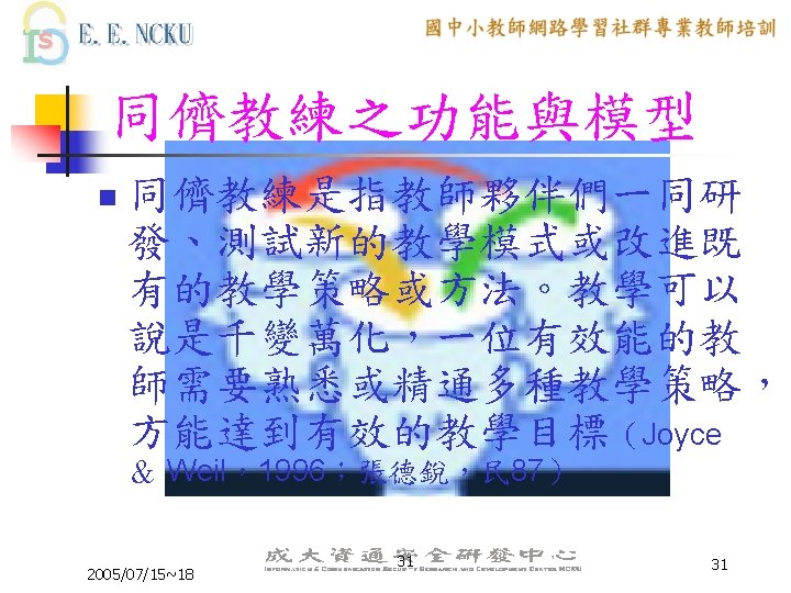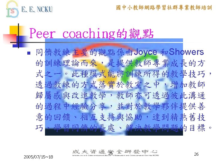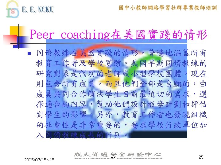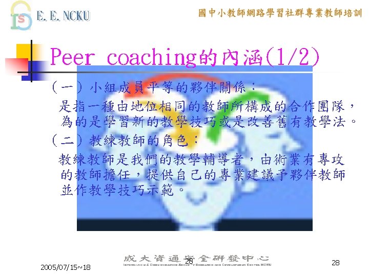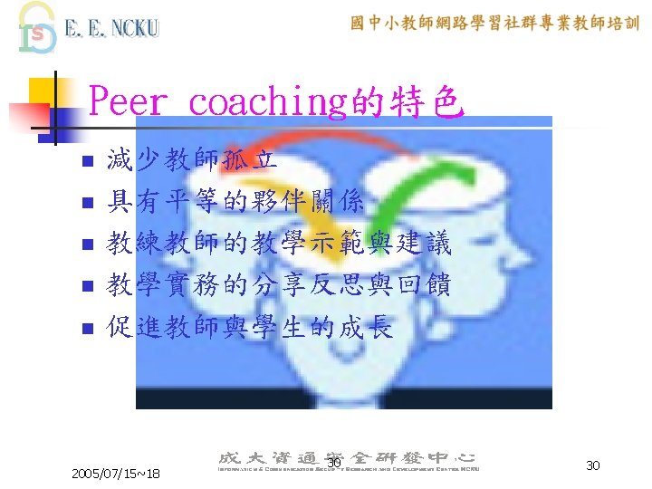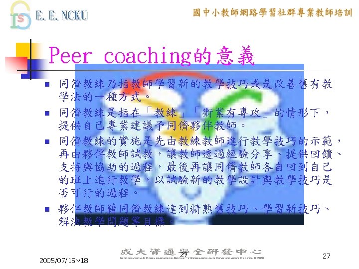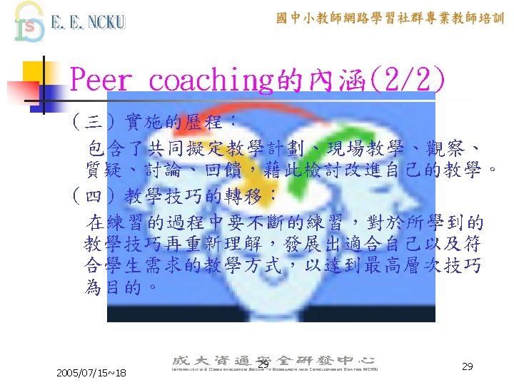 Peer Coaching 的三大主軸 n n n Communication Skill Lesson Design ICT skill 2005/07/15~18 6 6