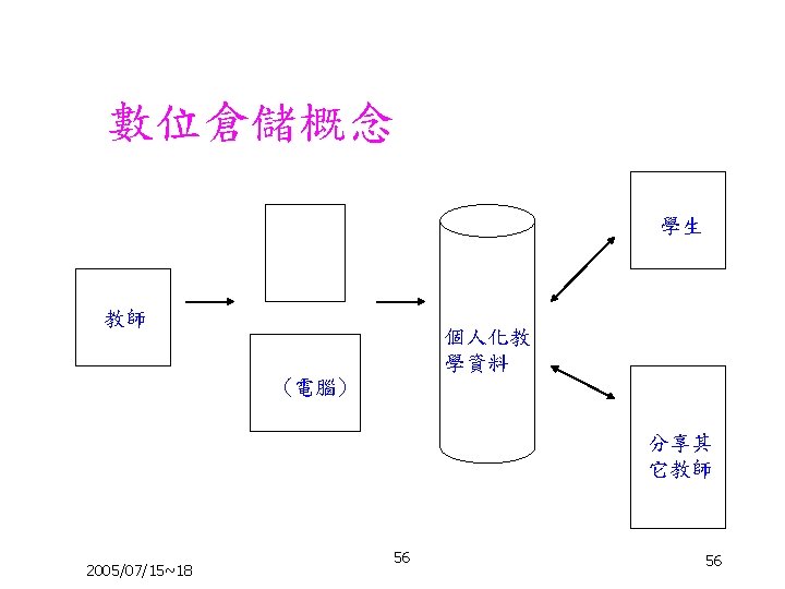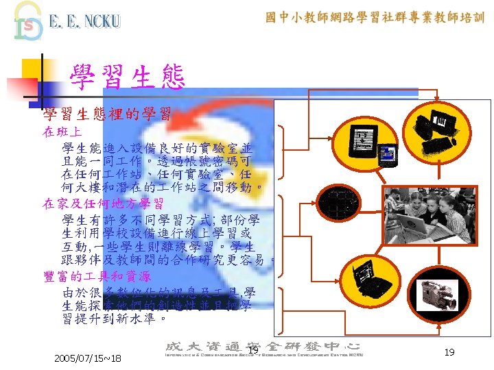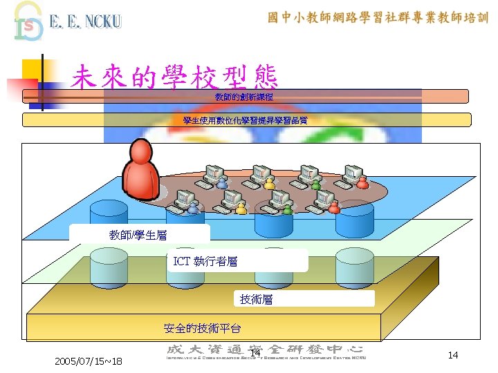 未來的教室型態 透過無線的 作站/可攜式電腦 /Tablet PC 網路 Curriculum server & Instructional Innovation 2005/07/15~18 從衛星網路下載 Central learning resources 與學習網際網路連接 Local ISP Internet 13 13