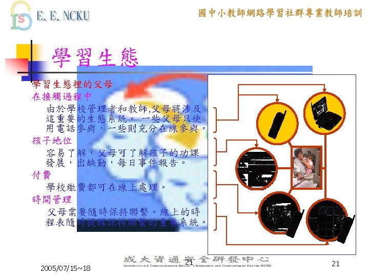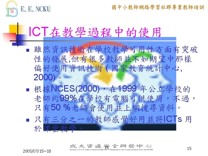 教學網站資源(3/4) 各縣市九年一貫課程教材資源網站: n n n n n 桃園縣http: //www. boe. tyc. edu. tw/curri/ 高雄市http: //www. ceag. kh. edu. tw/ 高雄縣http: //163. 16. 199/teach 9 y/ 雲林縣http: //bsd 02. ylc. edu. tw/ 新竹市http: //www. hceb. edu. tw/nine 2 one/index. asp 嘉義市http: //eje. cy. edu. tw/neweje/ 彰化縣http: //esky. chc. edu. tw/ 澎湖縣http: //91. phc. edu. tw/ 台北縣http: //src. tpc. edu. tw: 8080/index. jsp 2005/07/15~18 40 40
