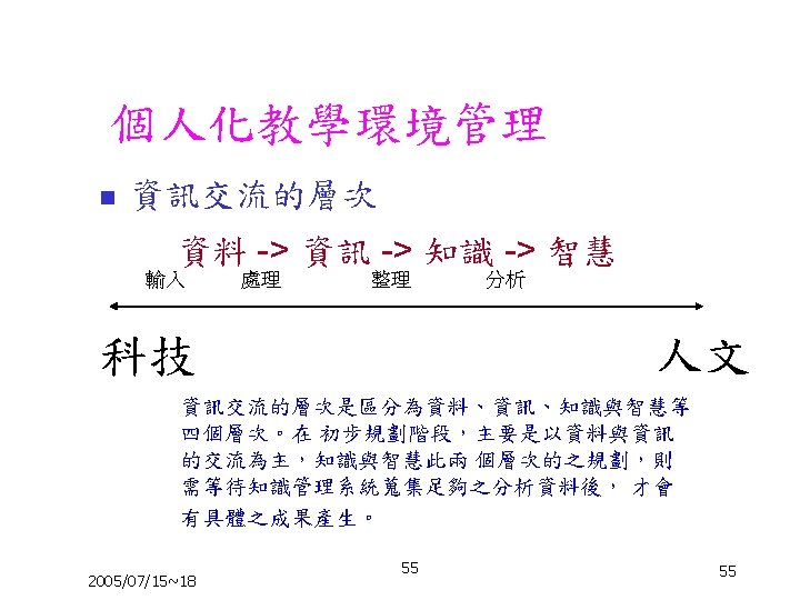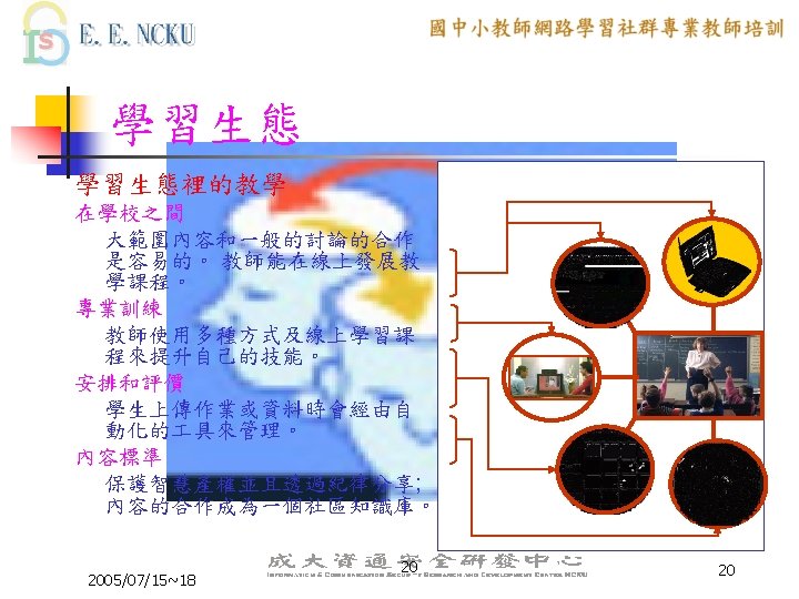 教學網站資源(4/4) 個人教學網站: n n n http: //thlee. nccu. edu. tw/estudy/modules/news/ 李昌雄老師的教學網站 http: //idvweb. creativity. edu. tw/ortus/modules/news/ 張麗華老師藝術與人文的教學網站 http: //eln. creativity. edu. tw/bonjour/modules/news/ 黃雲龍課程入口網站 http: //eln. creativity. edu. tw/joshua/modules/newbb/ 王永銘老師教學網站 其他教學網站 2005/07/15~18 41 41