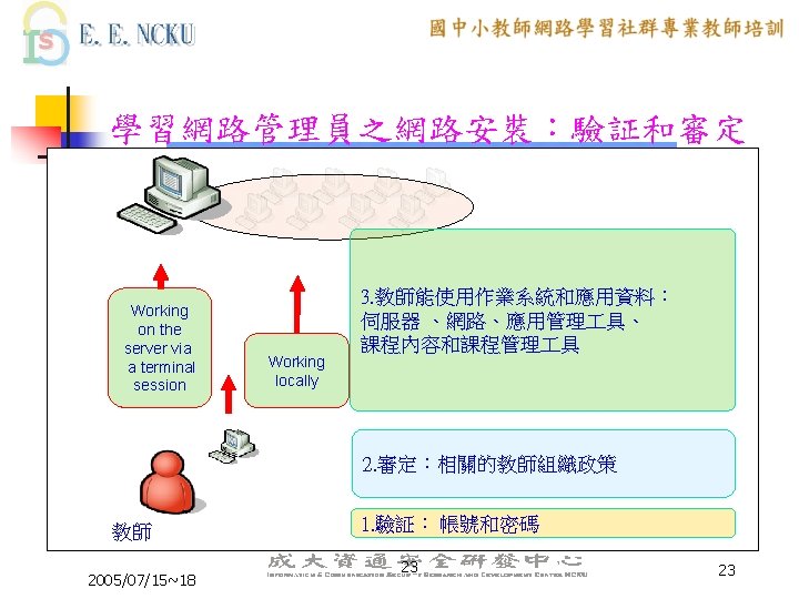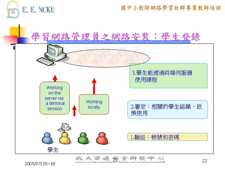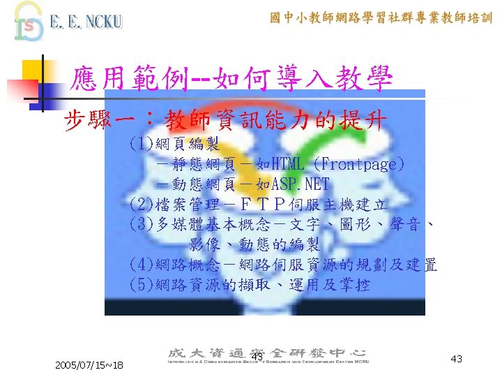 教學網路環境應用範例 n n n Web (http: //jerome. stu. edu. tw) FTP --Anonymous for public (ftp: //140. 127. 40. 36) --ID+ PASSWORD for student --ID+ password for myself Remote login 通訊錄 (http: //140. 127. 40. 36/asp/classasp) 即時文字互動 (http: //140. 127. 40. 36/interact/login. asp) 2005/07/15~18 42 42