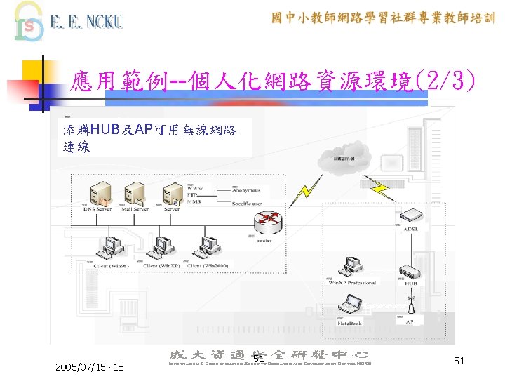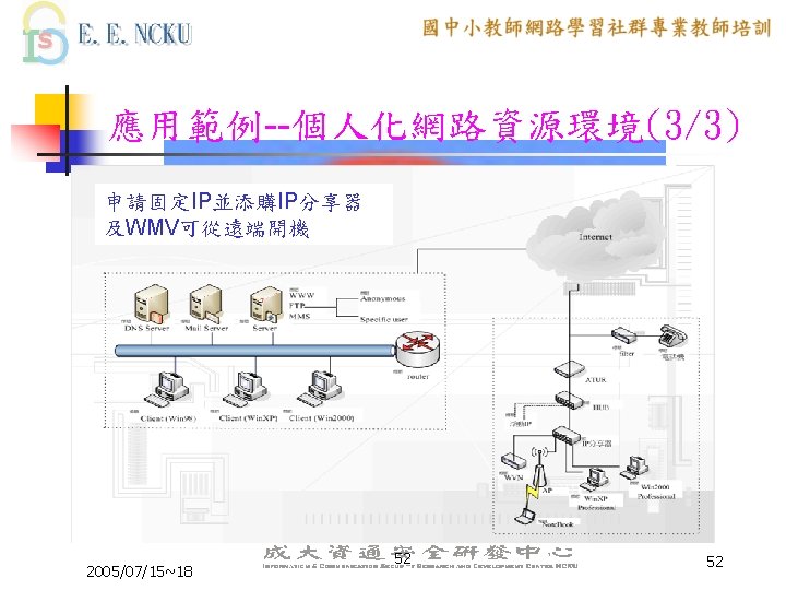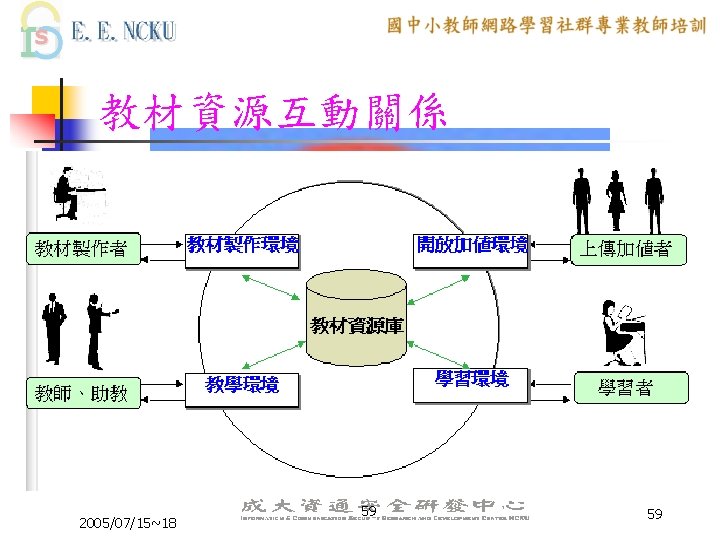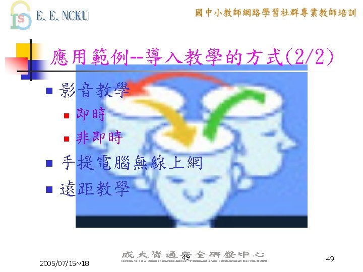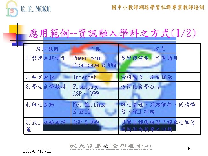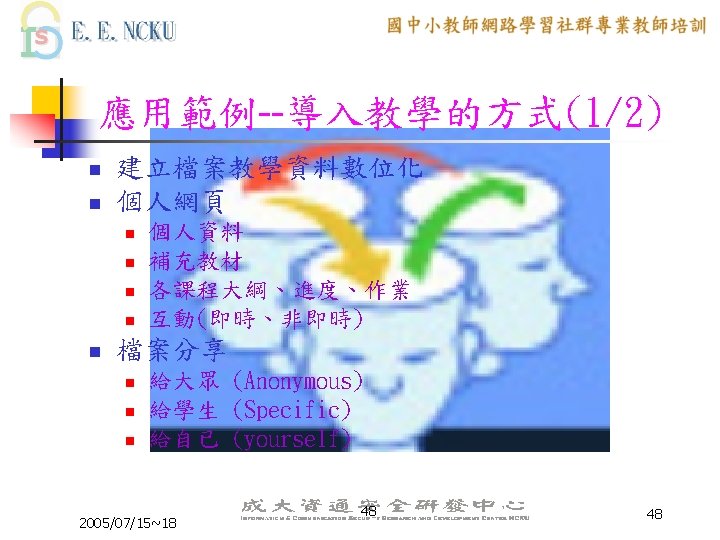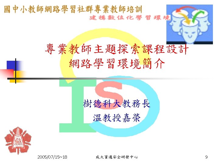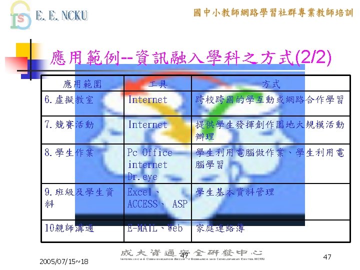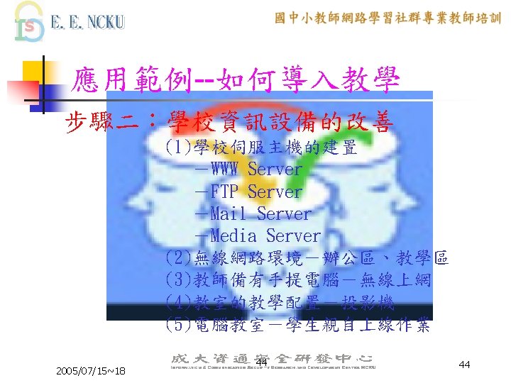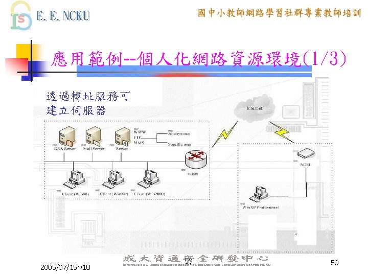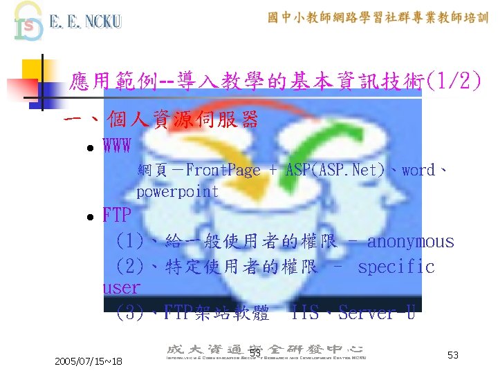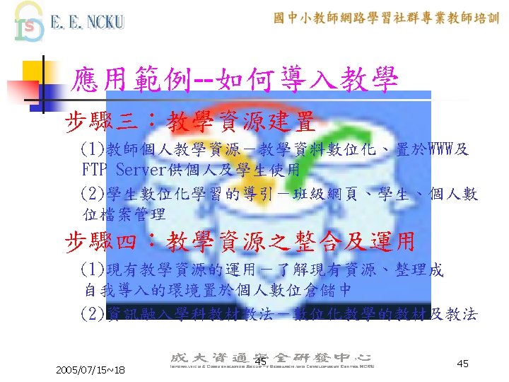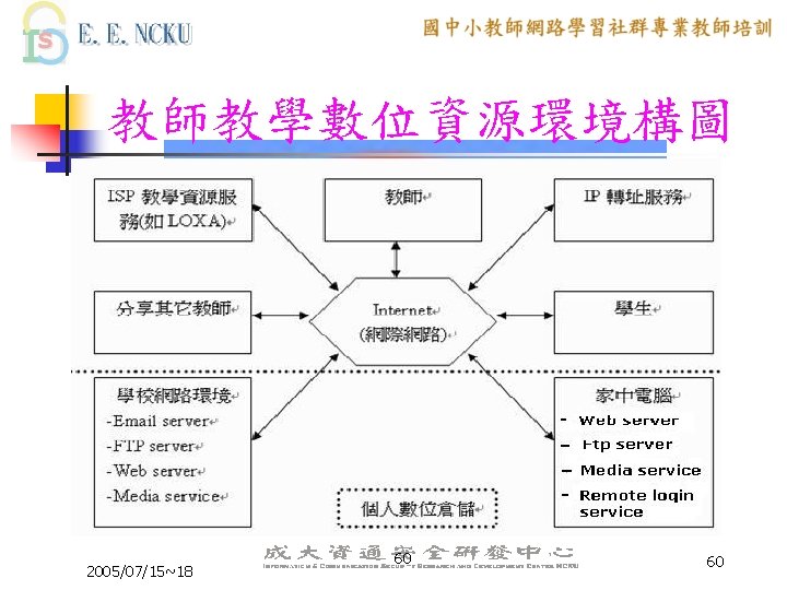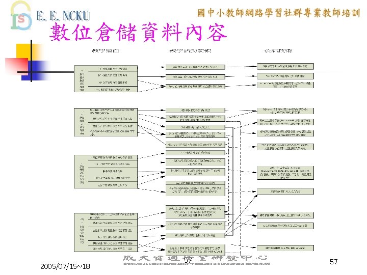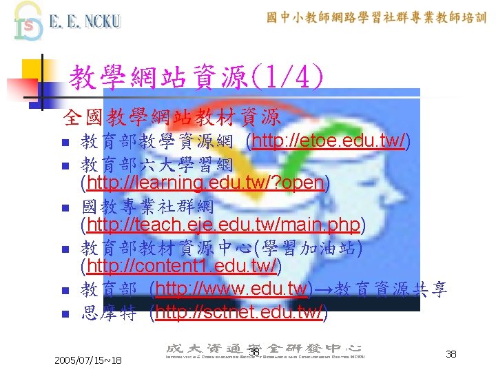 教學網站資源(2/4) 各縣市九年一貫課程教材資源網站: n n n n n 台中市http: //etoe. tceb. edu. tw/ 南投縣http: //nirc. encntc. edu. tw/ 台中縣http: //course 9. boe. tcc. edu. tw/ 台北市http: //course 9. ccjh. tp. edu. tw/ 台南市http: //www. tn. edu. tw/91 e/ 台南縣http: //happygo. tnc. edu. tw/ 宜蘭縣http: //oai. ilc. edu. tw/index. jsp 屏東縣http: //61. 221. 239. 30/ 苗栗縣http: //9 years. mlc. edu. tw/ 2005/07/15~18 39 39
