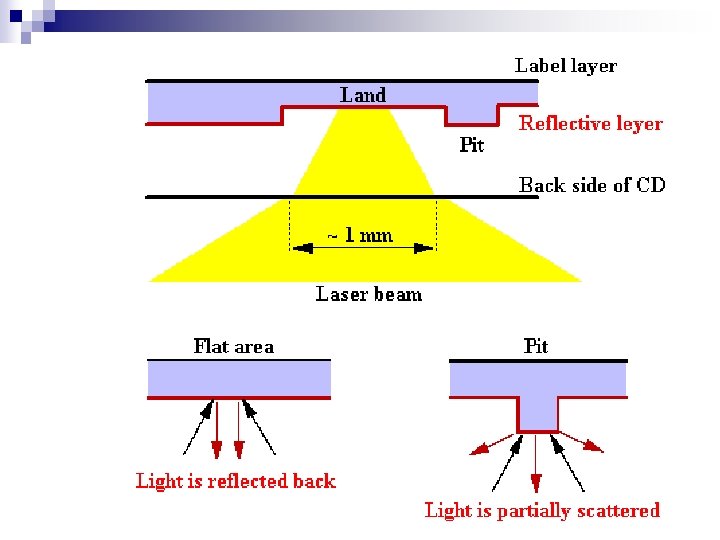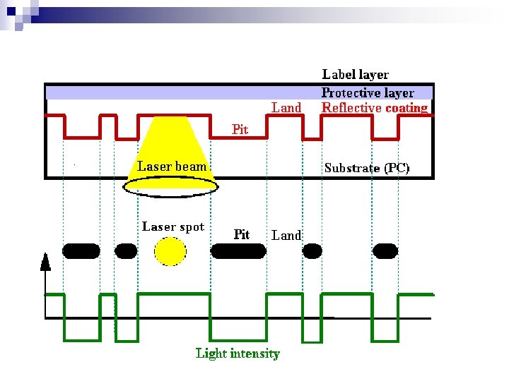 Pits and lands Reading the information back from a disc is a matter of bouncing a low-powered laser beam off the reflective layer in the disc. n Photo sensitive receptor detects when the light is reflected back. n When the light hits a land then the light will be reflected back otherwise no light will be reflected back. n