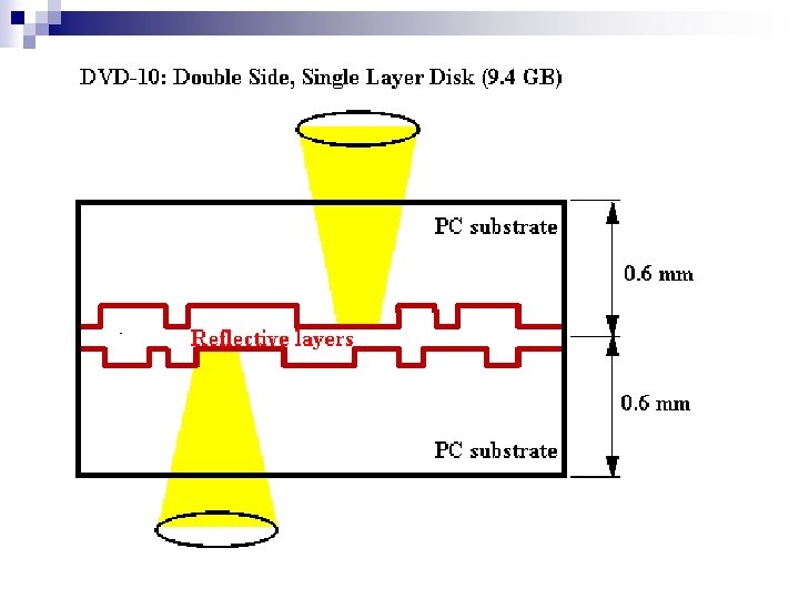 n n n Each recorded layer is coated with a thin film of metal to reflect the laser light. The outer layer has a thinner coating to allow the light to pass through to read the inner layer. If the disc is single sided , label can be placed on top. If it is double sided only a small ring near a center provide room for labeling. The laser can shines a focus beam on the under side of the disc and a photosensitive receptor detects. The individual pits on DVD are 0. 105 micron deep and 0. 4 micron wide.