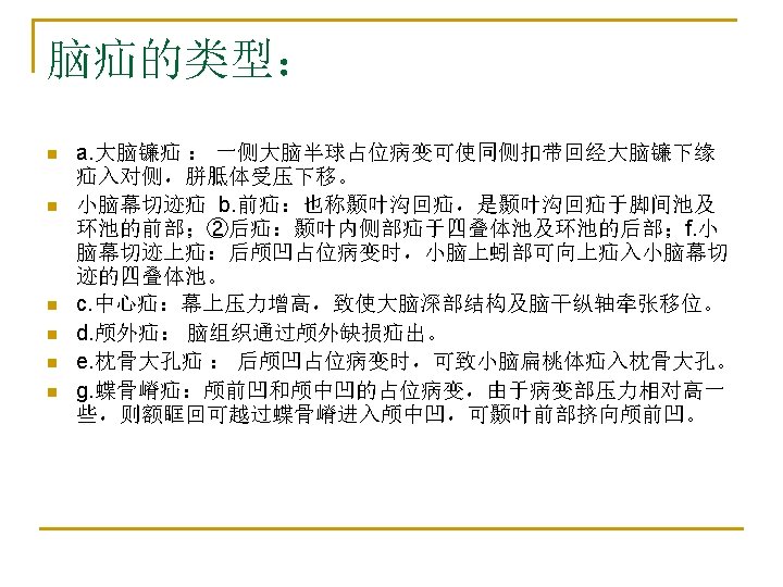 示意图 n n n n a) subfalcial (cingulate) herniation ; 镰下疝 b) uncal herniation ; 钩疝 c) downward (central, transtentorial) herniation ; 下行性小脑幕疝 d) external herniation ; 颅外 疝 e) tonsillar herniation. 扁桃体 疝 f) ascending transtentorial herniation (reversed tentorial)上行性小脑幕疝 g) sphenoid herniation蝶骨 嵴疝