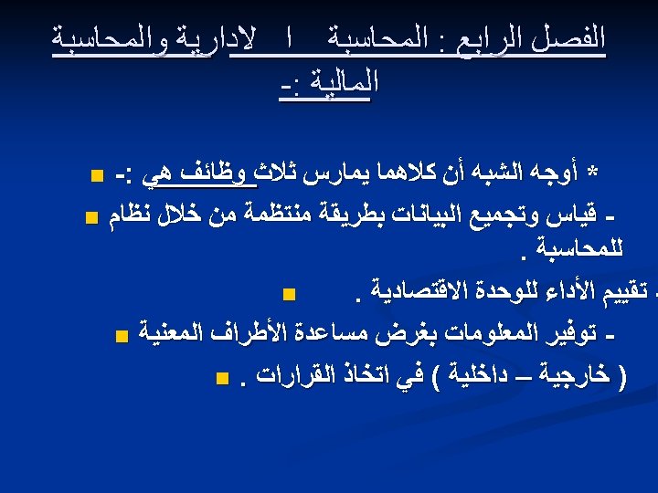 Financial and Management Accounting n The major distinction between financial and management accounting is the users of the information. Financial accounting serves external users. n Management accounting serves internal users, such as top executives, management, and administrators within organizations. n