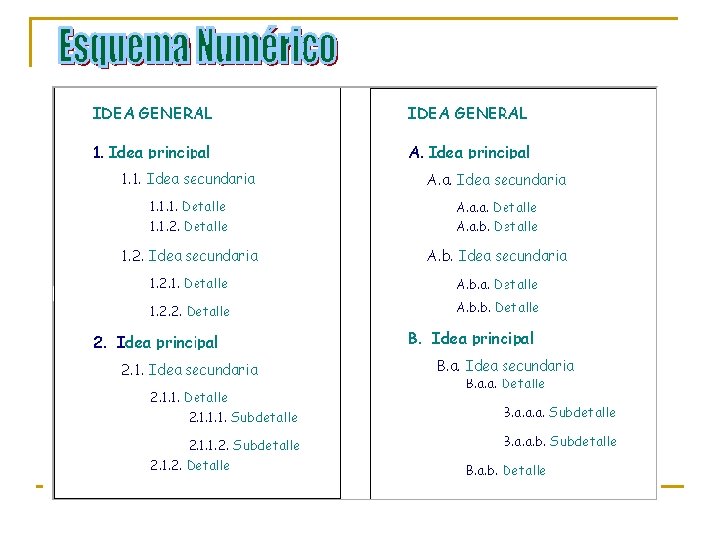 Esquemas numerados: n Para crear índices de estudio, que nos facilite la organización de los contenidos y el orden o importancia en que debemos estudiarlos. Por ejemplo cuando nos entregan un documento del que no tenemos una estructura clara, debemos construir un índice para su seguimiento y estudio.