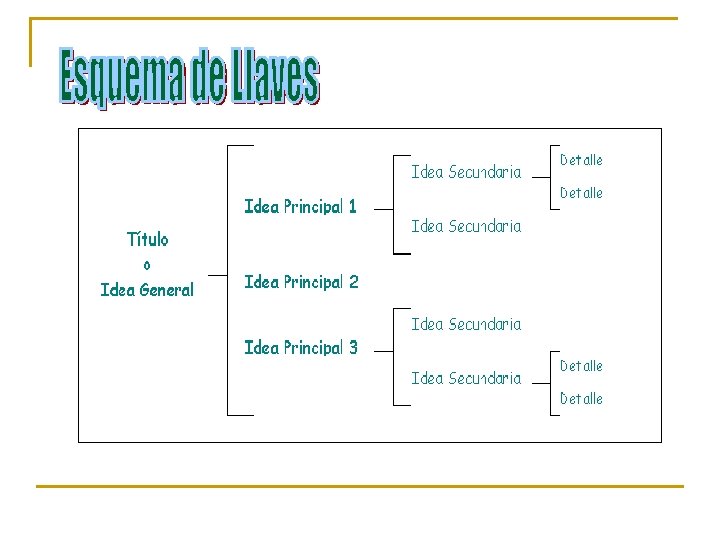 Presenta el resumen de un texto de manera estructurada, sucinta y en forma desagregada n n Características: Presenta los contenidos en tres niveles Su elaboración requiere del espacio vertical y horizontal Las llaves en forma sucesiva deben mantener una jerarquía sucesiva Los datos que se encuentren en cada llave deben tener la misma jerarquía
