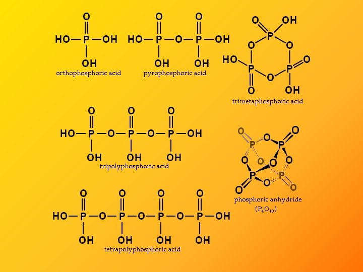 H 4 P 2 O 7 (kys. difosforečná) • • vyrábí se termickou kondenzací kys. fosforečné je to silná čtyřsytná kyselina (p. KA 1 = 1, 0; p. KA 2 = 2, 0 a p. KA 3 = 6, 6; p. KA 2 = 9, 6) tvoří jen difosforečnany a dihydrogendifosforečnany (viz hodnoty p. KA) tyto soli vznikají termickou kondenzací (dehydratací) hydrogenfosforečnanů, či dihydrogenfosforečnanů dihydrogenfosforečnany jsou rozpustné, difosforečnany jen s alkal. kationty používají se v potravinářství (tavené sýry) trifosforečnany jako detergenty estery oligofosforečných kyselin jsou biologicky významné (ATP atd. )