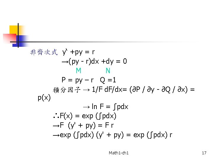 條件→ ∴ u = ∫Mdx + k(y) or u=∫Ndy + l(x) Example 1、Example 2 (P 27) n 積分因子(Integrating Factors) P(x, y)dx + Q(x, y)dy =0 如為非恰當(nonexact) 但 FPdx + FQdy = 0 可為恰當(exact) 則 F→積分因子 Example 4(P 29) Math 1 -ch 1 13