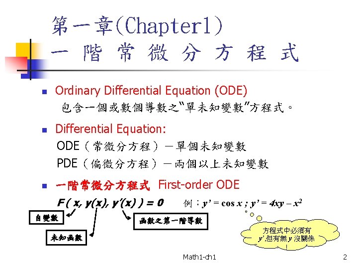 n Bernoulli Eq y' + p(x) y = g(x) y a a=0 a =1 不同於r(x), 乃存在y之函 數 Non-homogenous (1 th ODE) Homogenous (1 th ODE) Linear 線性微分方程式 a>1 Nonlinear 非線性微分方程式 Math 1 -ch 1 19