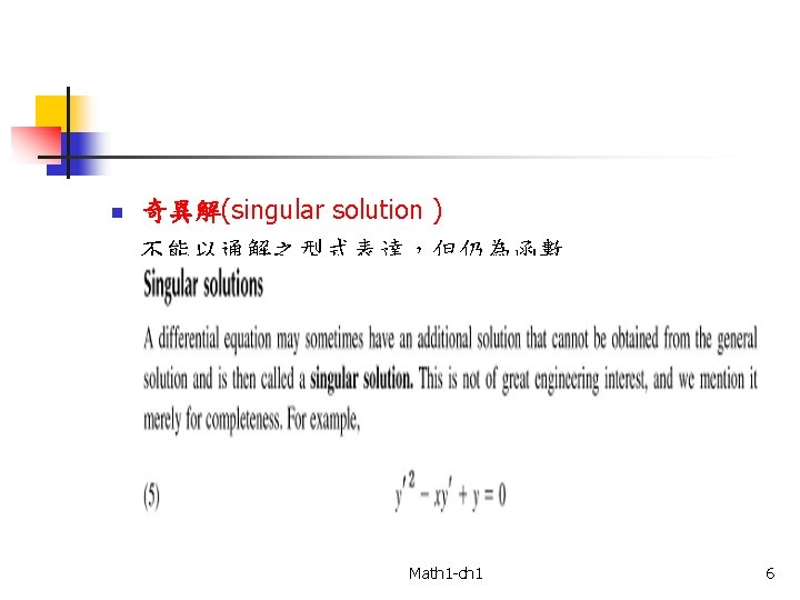 n 解(solution): 通解 (general solution ) 包含未定常數 滿足該ODE之任何函數 p. 5 example 3 特解(particular solution ) 特定常數 p. 4 example 1 初始條件 ( initial condition) 由 通解 特解 邊界條件 (boundary condition) Math 1 -ch 1 4