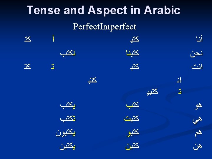 Tense and Aspect in Arabic n n n Arabic has two tenses: past and present. Future tense is indicated by means of future particles ( )ﺳــــ or ( ) ﺳﻮﻑ Arabic has two aspects: 1 - The perfect refers to a past time or completed action. 2 - The imperfect refers to present or non-past time