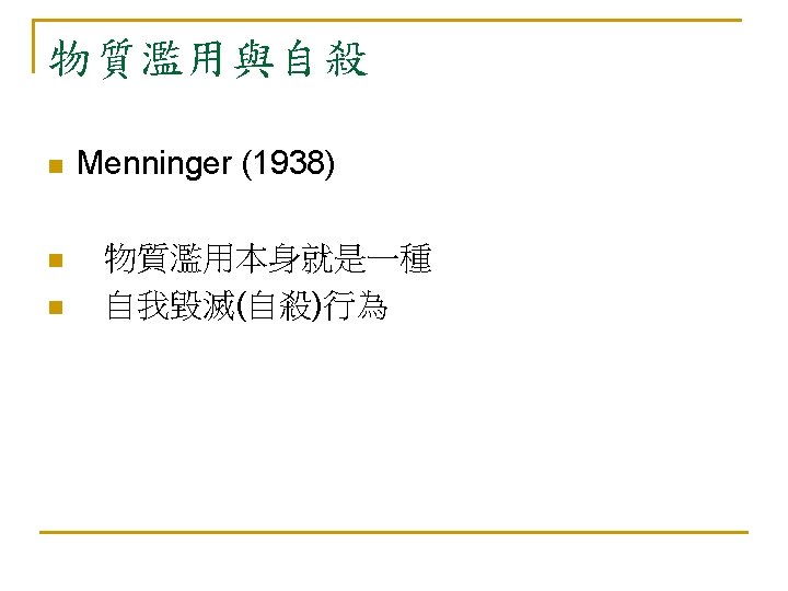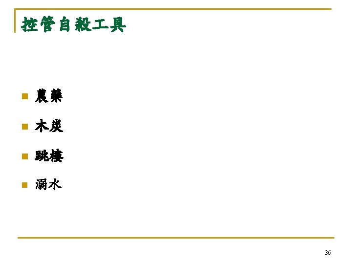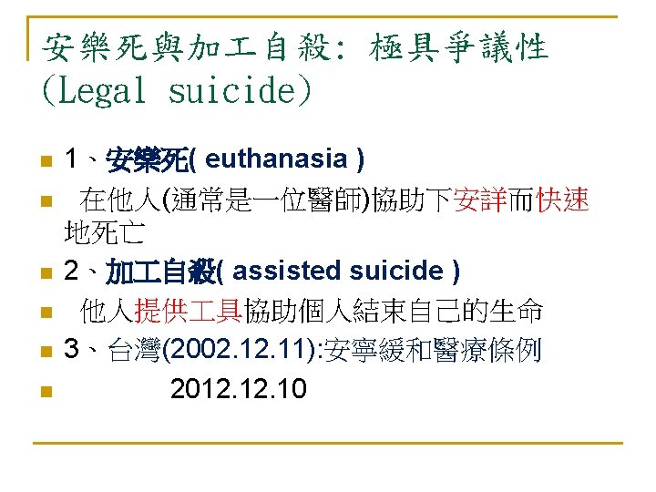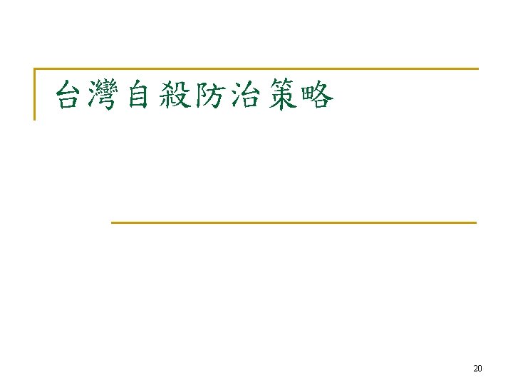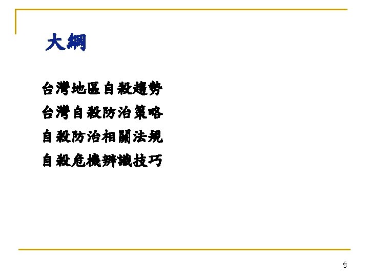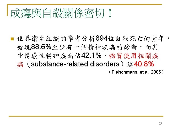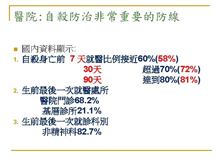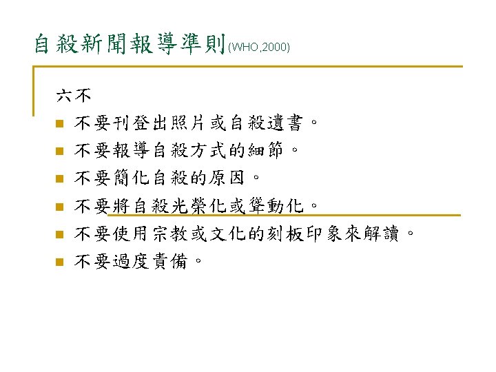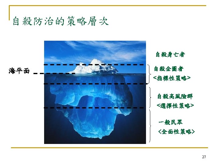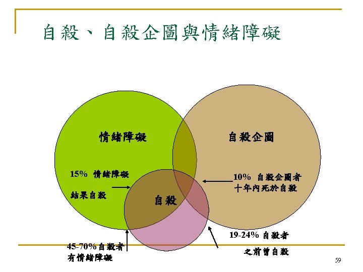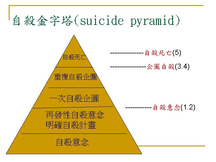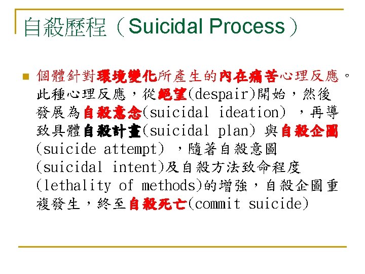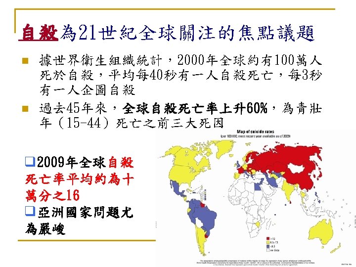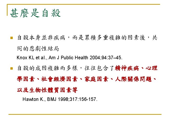 自殺:亙古的問題 新的挑戰 n 自殺是人類非必要早夭的主要原因 (The leading cause of unnecessary, pre-mature death. ) n --Maris et al, 2000