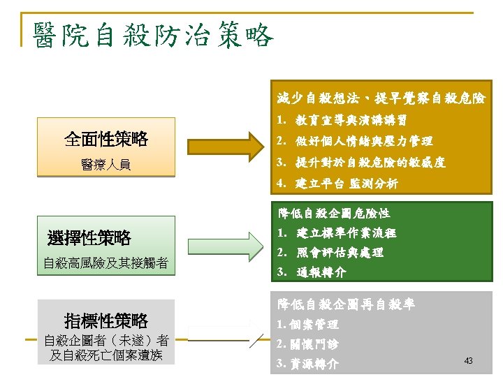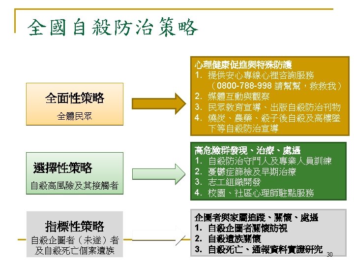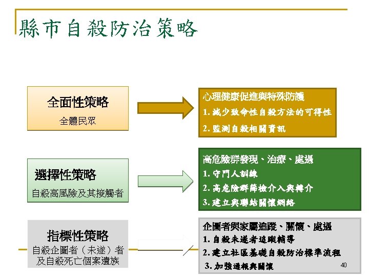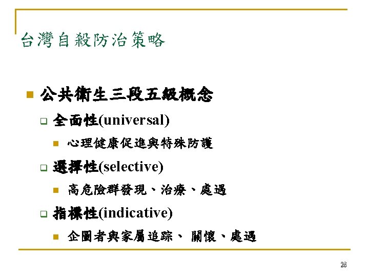 Both Risk & Population-based Approach Universal (全面性) Selective (選擇性) Population Mortality threshold Indicative (指標性) Low High Suicide risk