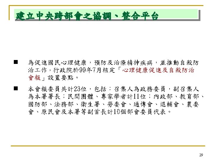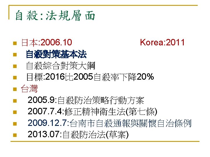 自殺死亡統計: 2013. 12 vs. 2012. 12 2013. 12 2012. 12 全國 台北市 新北市 台中市 台南市 高雄市 桃園縣 增減數 數目 百分比 全體 3, 262 3, 766 -504 -13. 4 65 + 800 835 -4. 2 全體 241 333 -92 -27. 6 65 + 69 65 4 6. 2 全體 508 573 -65 -11. 3 65 + 97 95 2 2. 1 全體 318 366 -48 -13. 1 65 + 64 67 -3 -4. 5 全體 298 322 -24 -7. 5 65 + 80 82 -2 -2. 4 全體 415 517 -102 -19. 7 65 + 84 99 -15. 2 全體 261 338 -77 -22. 8 65 + 48 78 -30 -38. 5 衛福部: 2014. 02. 25 初步統計