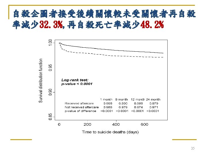 2011年自殺通報性別年齡層別促發原因 男性 女性 自殺原因 15 -24% 25 -44% 45 -64% 65+% 總% 家人間情感因素 21. 3 17. 5 18. 9 18. 6 18. 7 20. 5 19. 9 28. 7 24. 7 22. 5 憂鬱傾向 16. 8 17. 9 16. 1 17. 5 15. 9 22. 7 26. 2 22. 4 22. 5 感情因素 31. 3 16. 7 4. 4 1. 2 13. 4 43. 4 25. 1 8 1. 1 22. 2 有憂鬱症病史 11. 1 11. 3 9. 8 6. 2 10. 9 18. 9 20. 8 9. 6 17. 5 夫妻問題 1. 5 12. 1 12. 5 7. 4 10. 1 4. 9 19. 3 19. 9 7. 4 16. 5 疾病因素 1. 8 4. 1 14. 9 42. 3 11. 4 1. 7 3 8. 6 39. 8 6. 4 失業 3. 6 11. 9 12. 9 0. 9 9. 6 1. 8 4. 5 3. 9 0. 5 3. 7 2011. 1~2011. 12 全國自殺通報個案自殺原因排名 34 34