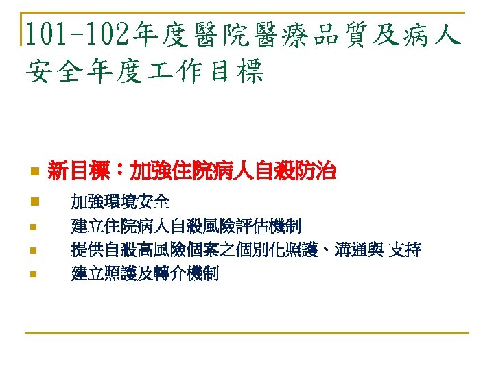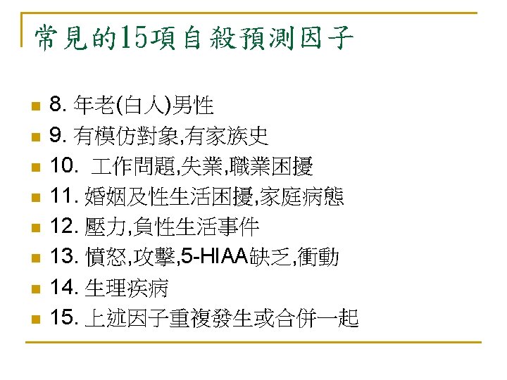 SAD PERSONS Previous suicide attempt 過去曾嘗試過自殺 Ethanol use 酒精濫用 Rational thinking loss 精神病狀態 Social support lacking 缺乏社會支持 Organized plan 有明確自殺計劃或規劃中 No spouse 離婚、喪偶、分居或單身 Sickness 慢性且嚴重的身體疾病