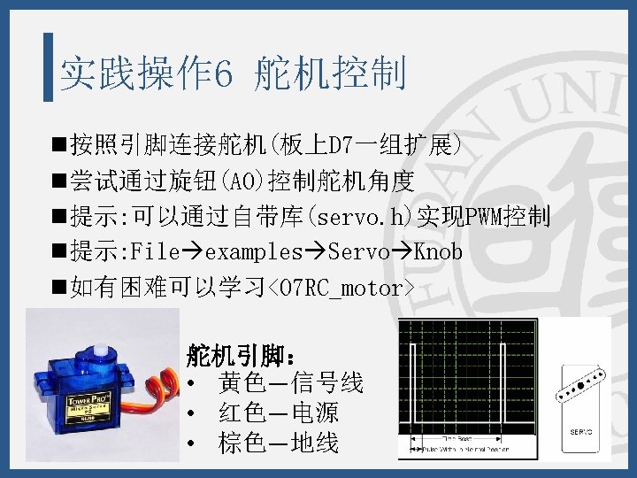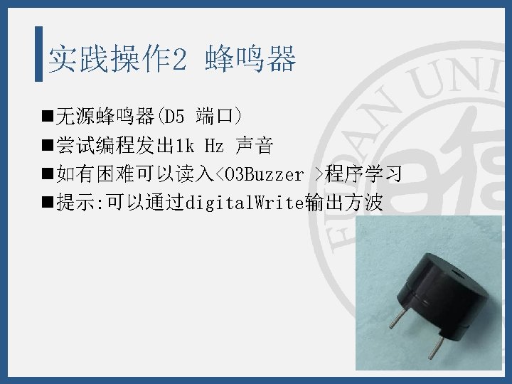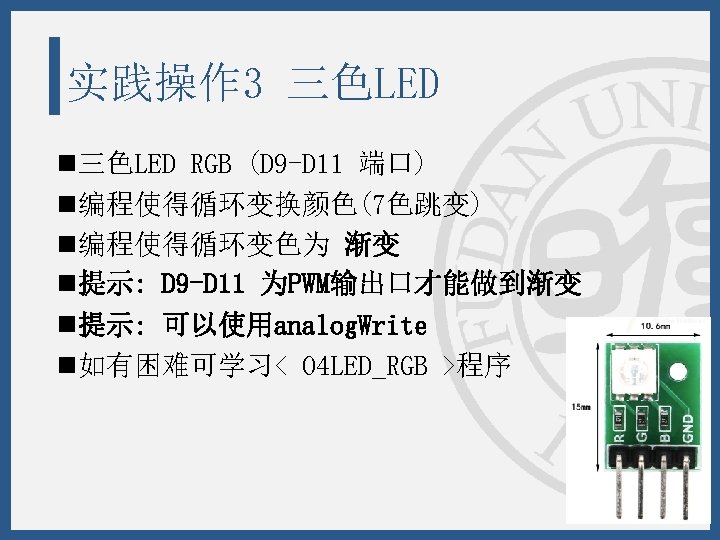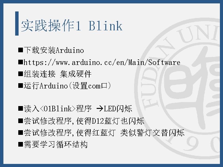 n UNO n NANO n MEGA n nArduino Slides: 31 Download presentation 硬件版本 n. UNO n. NANO n. MEGA 硬件购买 n尽早购买, 快递需要时间 n查找Arduino 入门套件 n费用? n. Sensor Shield n外壳 https: //item. taobao. com/item. htm? spm=a 1 z 10. 5 -c-s. w 400221286518114. 12. fb 3 c 33451 x. Cc 6 j&id=551784439011 https: //item. taobao. com/item. htm? spm=a 1 z 10. 5 -c-s. w 40022991865873. 56. 499740 b 4 KRCm 1 J&id=608600284227 更便宜的选择 n 9合一多功能扩展板 n 20元 https: //item. taobao. com/item. htm? spm=a 1 z 0 9. 2. 0. 0. 66 a 52 e 8 dspb. TWL&id=606705843290& _u=p 1 vmug 86049 更多教程及资源 nhttp: //phylab. fudan. edu. cn/doku. php? id=ar duino: start 实践操作 7 温湿度传感器 n导入库文件(一般厂家提供)实现DHT 11控制 n. Sketch Library 导入zip DHT 11. zip n如有困难可以学习< 08 dht 11 > 库文件路径 C: UsersuserDocumentsArduinolibraries 实践操作 8 1602 LED+I 2 C n导入库文件实现I 2 C控制 n. Sketch Library 导入 zip Liquid. Crystal_I 2 C 1602. zip n学习< 09 LC 1602_I 2 C >查看如何显示 n作业: 在液晶上显示温度, 湿度 期待大家的作品! Fleeing is not a good way. If we can't beat them, we'd better join them. 31