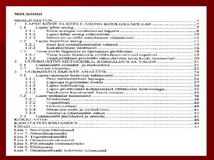 RÜHMATÖÖ Teema: Lapse arengu jälgimine lasteaias Ülesanne: rühmatööna koostada kava, kus oleks kaks peatükki, esimesel peatükil 3 alapeatükki ning kõigil alapeatükkidel ala-alapeatükid. Näidis: SISSEJUHATUS 1. . . . . (Teoreetilise osa üldine pealkiri) 1. 1. . . . . 1. 1. 1. . . . 1. 1. 2. . . 1. 1. 3. . . . 1. 2. 1. . . . . 1. 2. 2. . . . 1. 3. 1. . . . . 1. 3. 2. . . . . 2. UURIMUSE EESMÄRK JA METOODIKA KOKKUVÕTE KASUTATUD KIRJANDUS